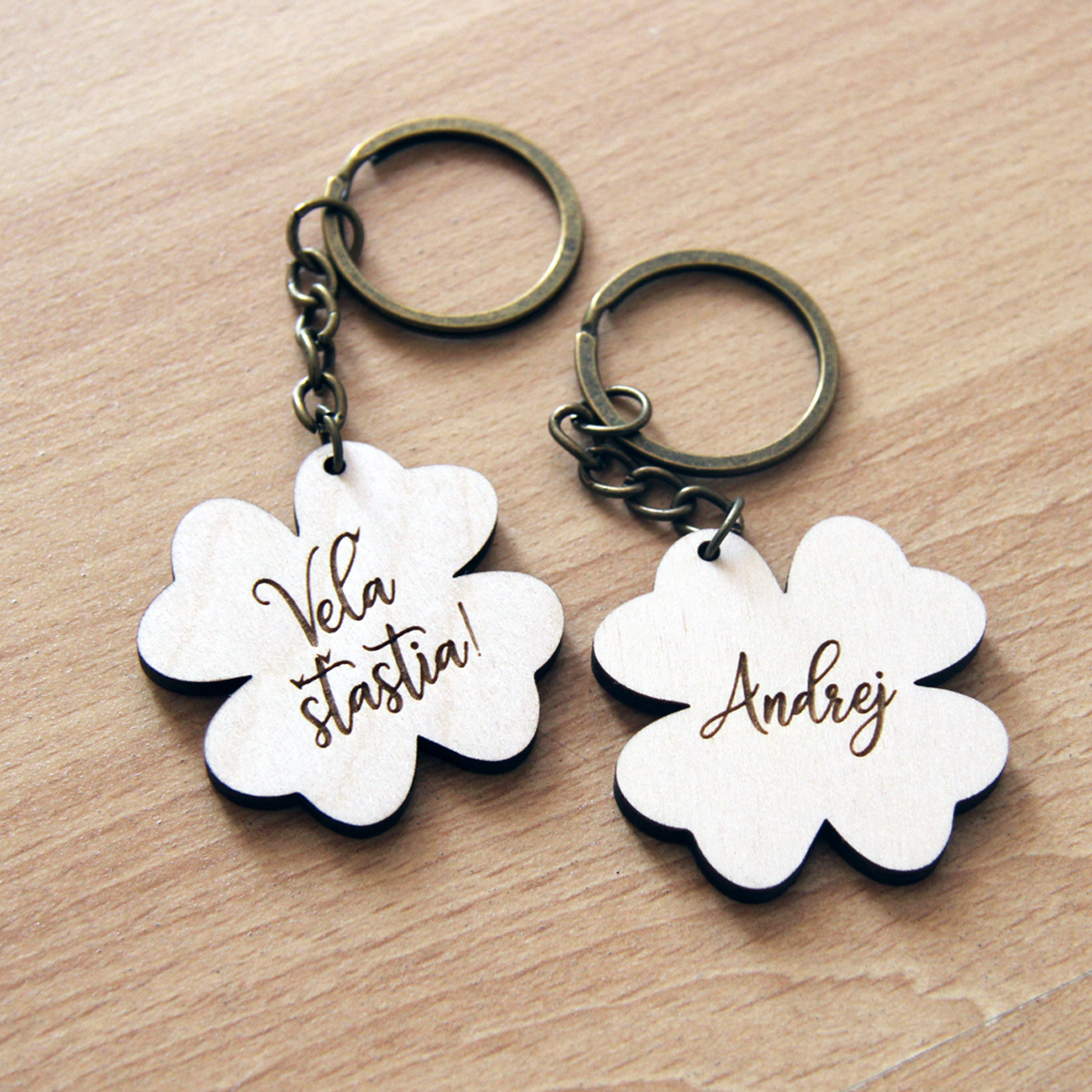 Kľúčenku v tvare štvorlístka si môžte zvoliť jednostranne gravírovanú, tzn. môžte si vybrať len s nápisom Veľa šťastia alebo napr. len s menom alebo obojstranne gravírovanú, kde z jednej strany je vygravírované meno a z druhej strany text Veľa šťastia. Súčasťou kľúčenky je aj retiazka a kľúčenkový krúžok vo farbe, ktorú si vyberiete.
