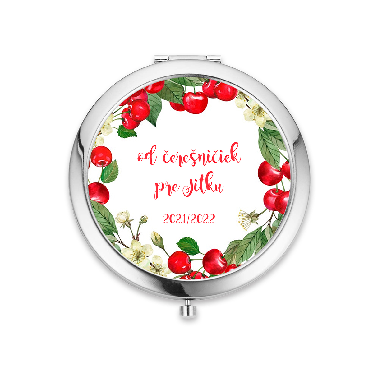 Kvalitné zrkadielko do kabelky s jednoduchým otváraním pomocou stlačenia. Zrkadielko je milým aj praktickým darčekom na koniec školského roka, na deň učiteľov alebo ako pamiatku pre pani učiteľku. Vo vnútri sú dve zrkadielka. Zrkadielko je z bižutérneho kovu bez obsahu niklu, olova a kadmia a grafický obrázok je pod vrstvou živice. Obrázok má priemer 57mm.