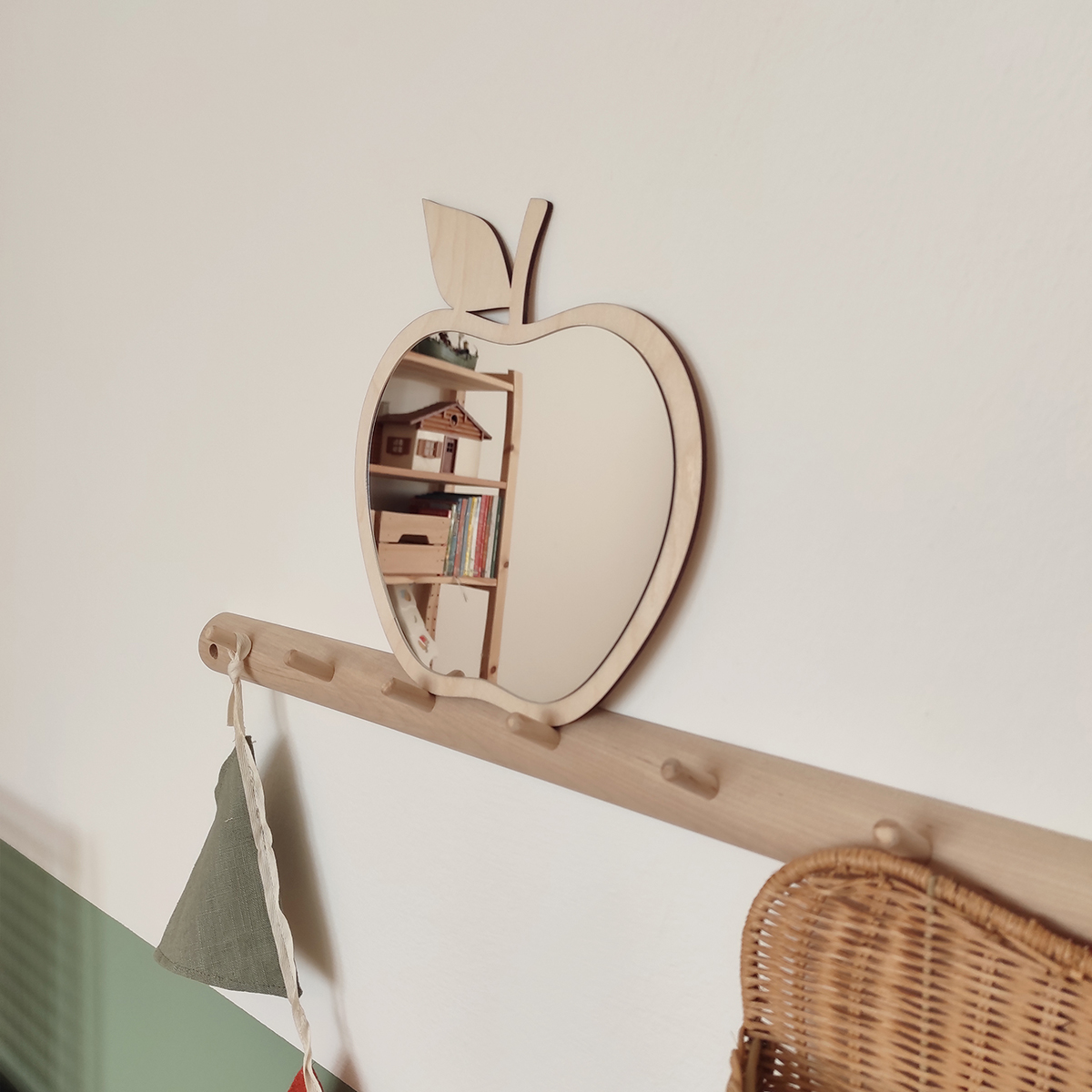 Originálne zrkadlo do detskej izby v tvare jabĺčka. Zrkadlo je vyrobené z drevenej preglejky hrúbky 4mm a zrkadlového plexiskla, takže sa nemusíte báť, že sa rozbije a že by si dieťatko mohlo ublížiť. Na zadnej strane je kovový háčik na zavesenie na stenu.