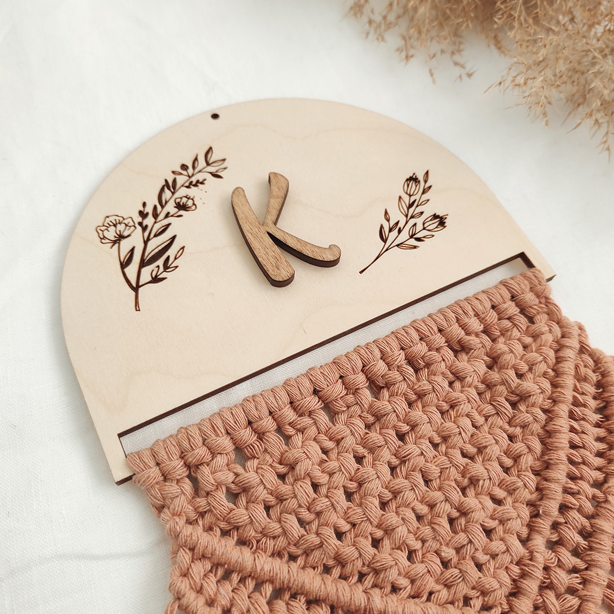 Krásna a jemná dekorácia do detskej izby s vygravírovanými kvietkami a vyrezaným písmenom (podľa Vášho želania) doplnená macrame špagátom.