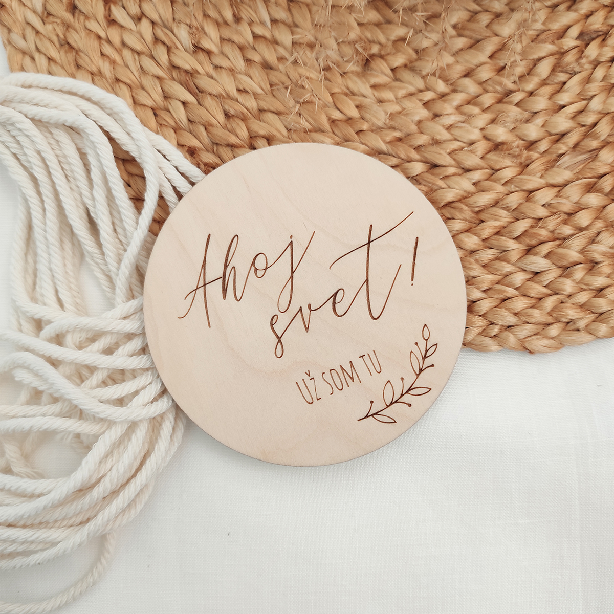 Originálna miľníčková tabuľka v tvare kruhu s vygravírovaným textom Ahoj svet! Už som tu a vetvičkou.