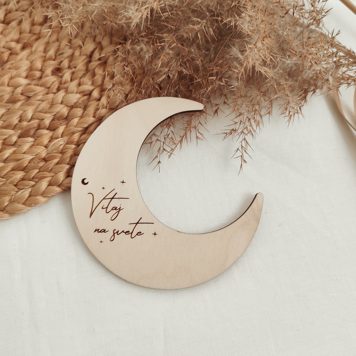 Miľníčky nemusia byť len v tvare kruhu. Vyrobili sme pre to túto originálnu miľníčkovú tabuľku v tvare mesiaca s vygravírovaným textom Vitaj na svete.