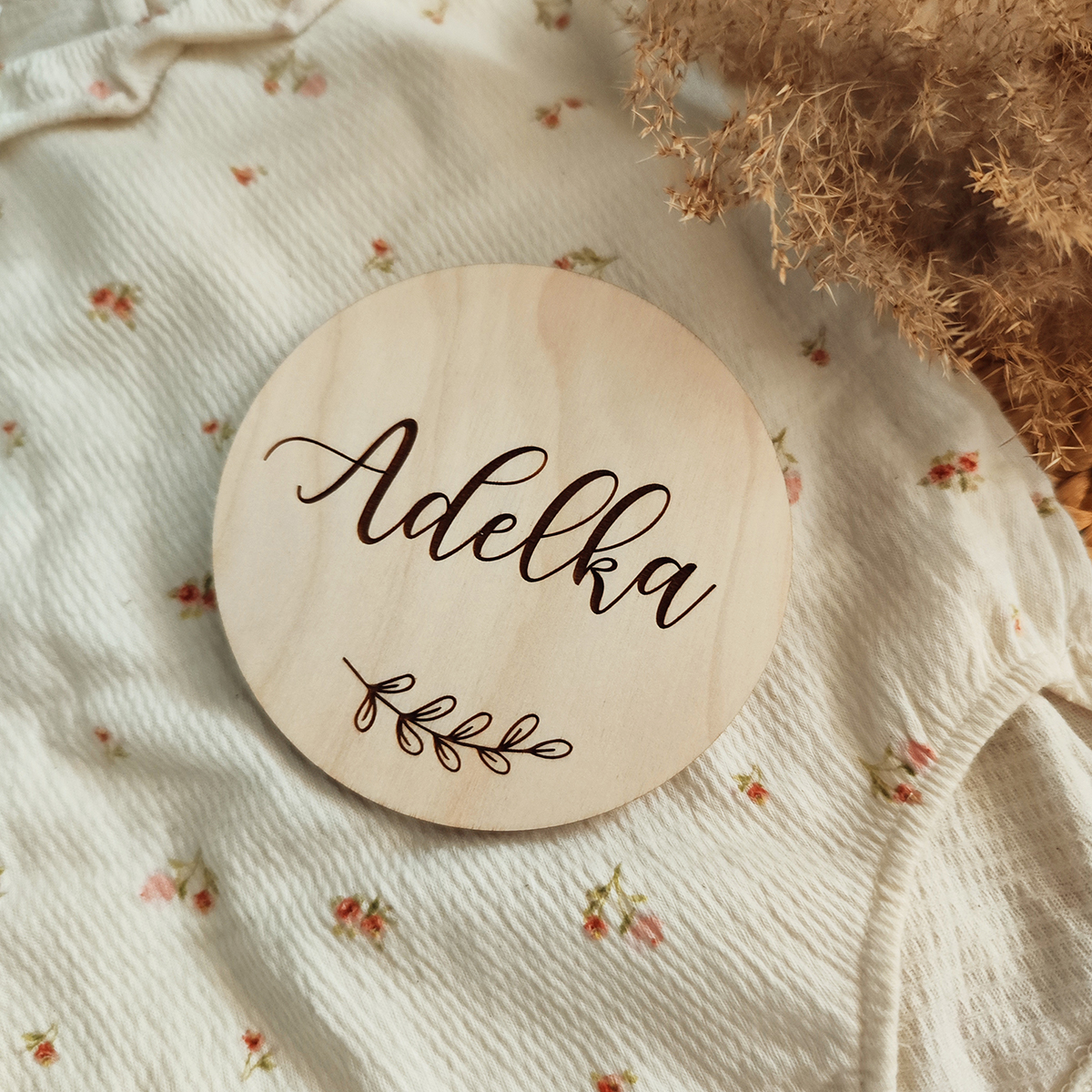 Originálna miľníčková tabuľka v tvare kruhu s vygravírovaným menom a vetvičkou.