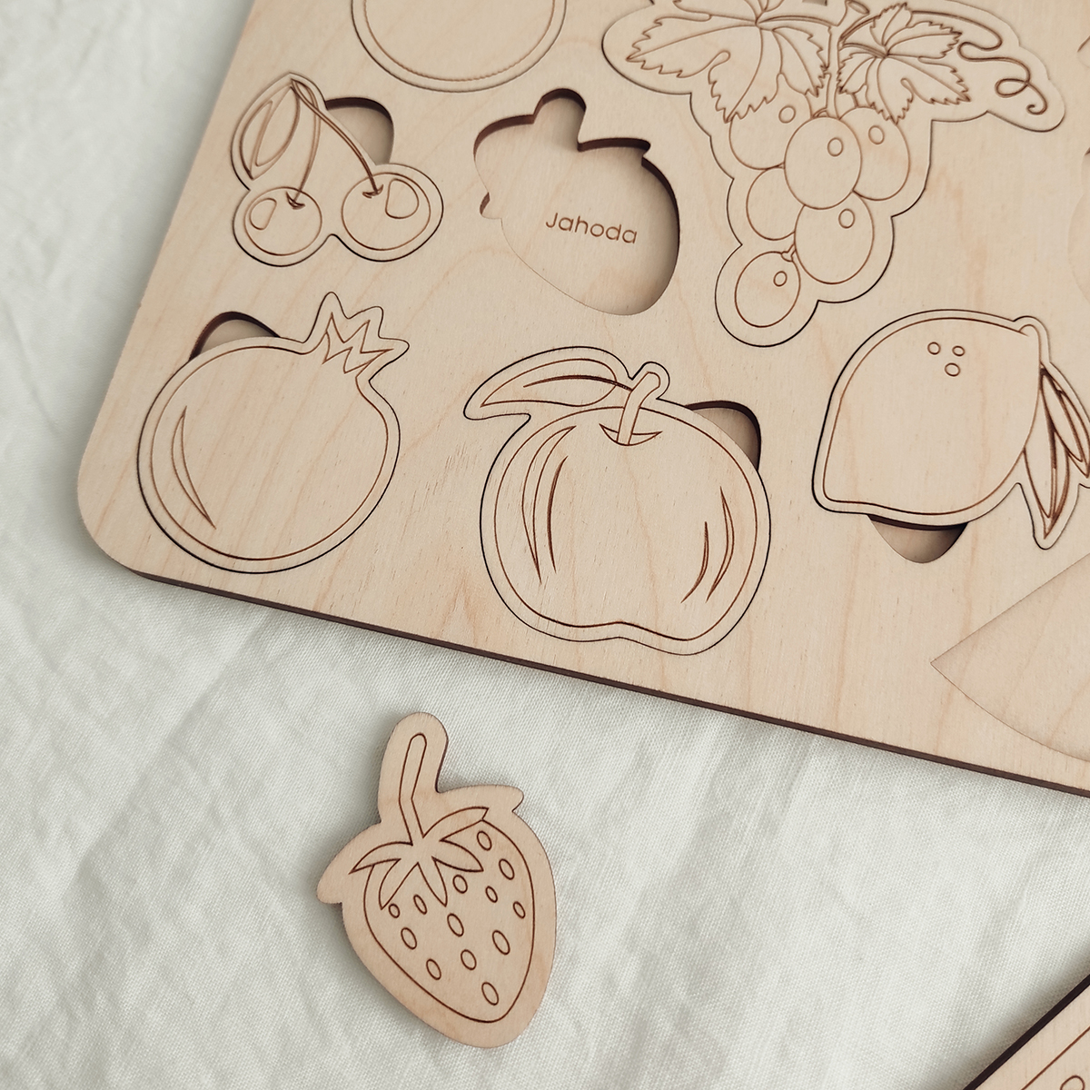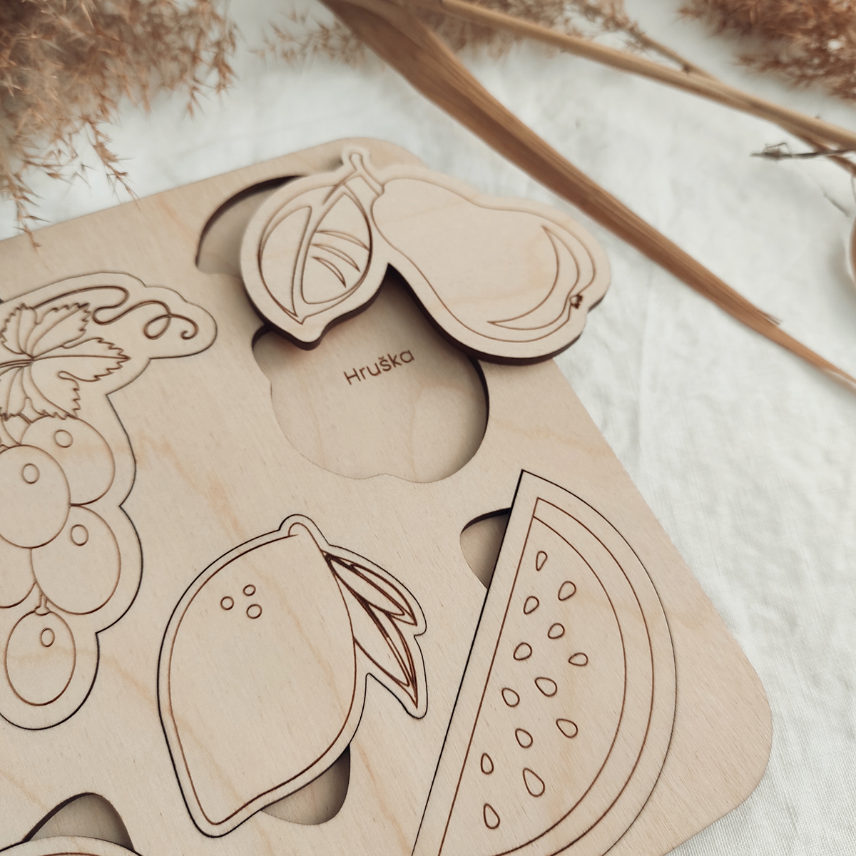 Vkladačka zabaví detičky, pomôže rozvíjať jemnú motoriku, zručnosť, sústredenie a pamäť a zároveň pomáha spoznávať druhy ovocia.