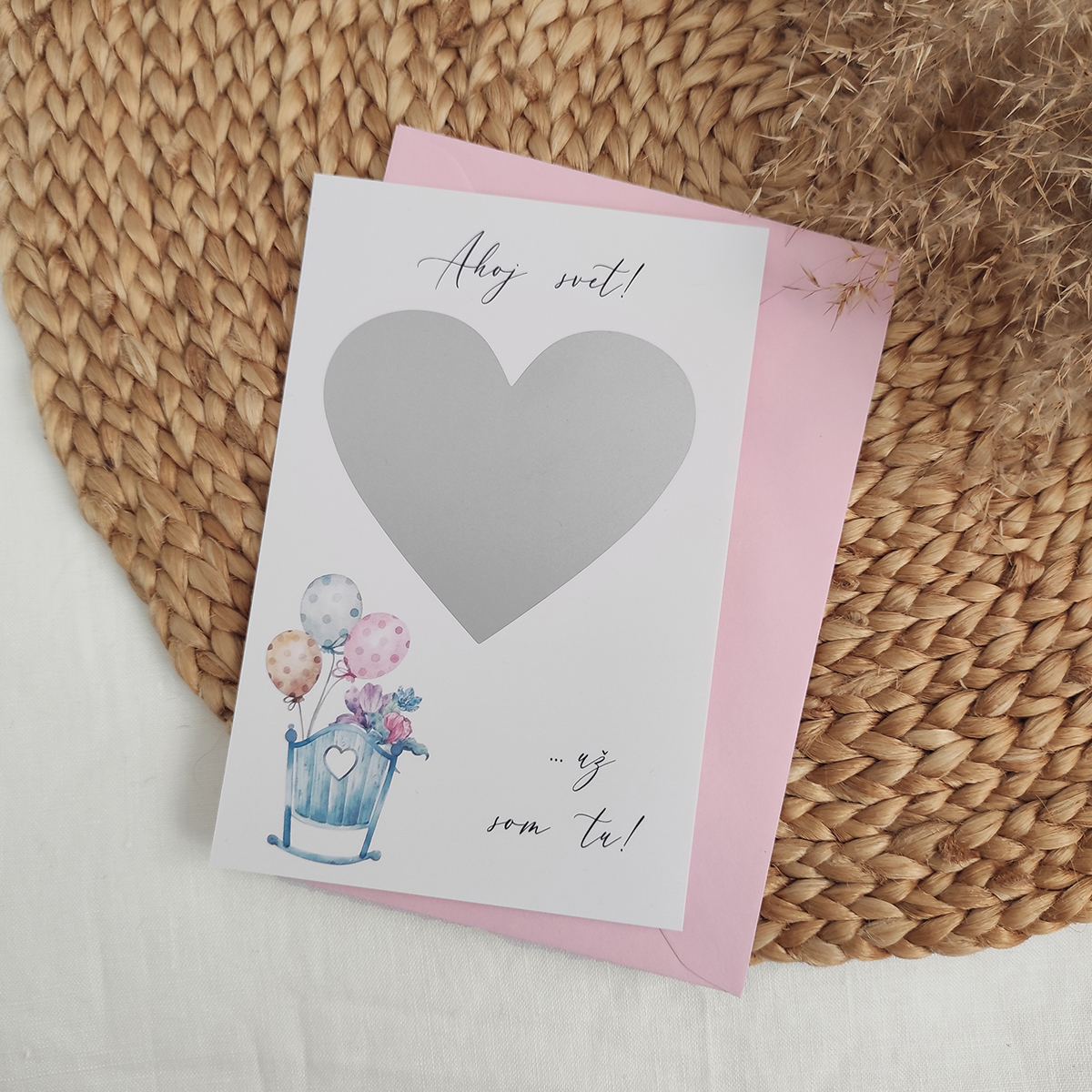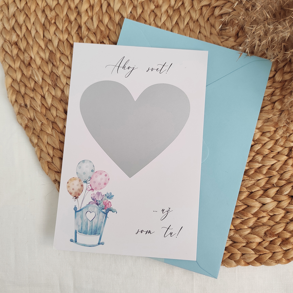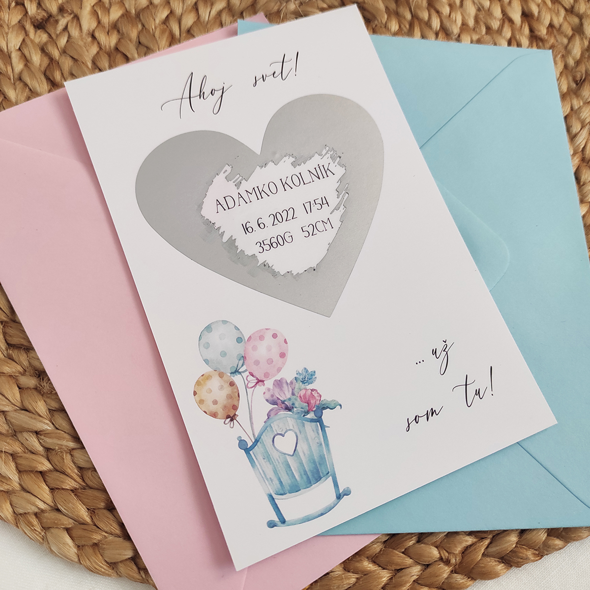 Oznámenie o narodení bábätka so stieracím srdiečkom, pod ktorým sa nachádza meno, dátum a čas narodenia a miery bábätka.