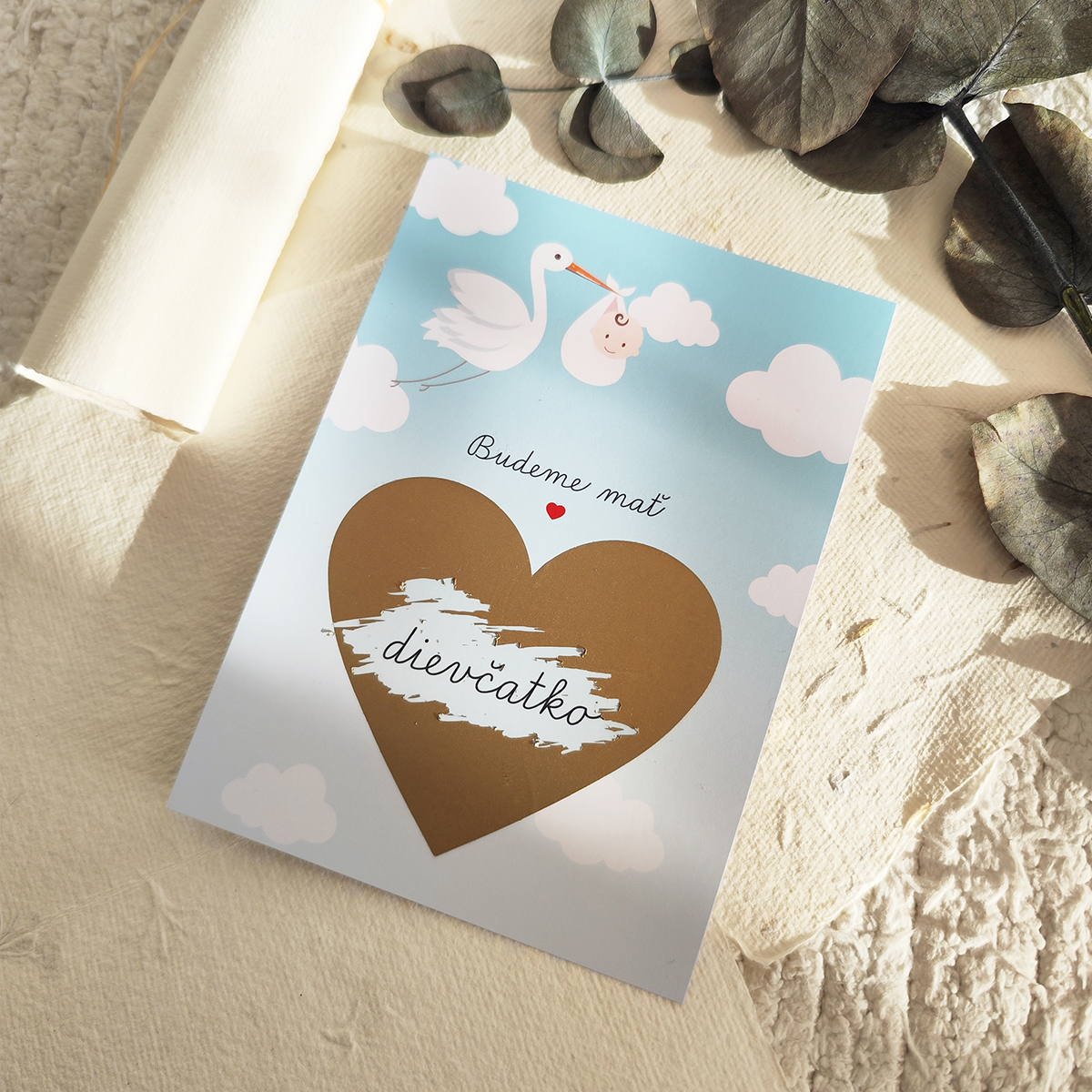 Oznámenie o narodení bábätka so stieracím srdiečkom, pod ktorým sa nachádza či čakáte dievčatko alebo chlapčeka.