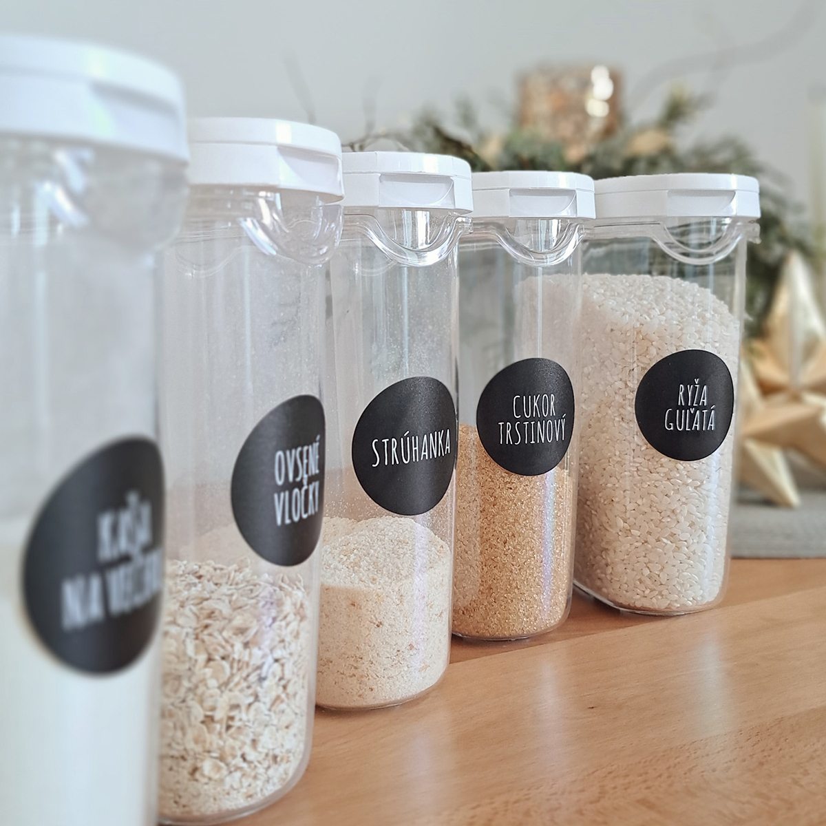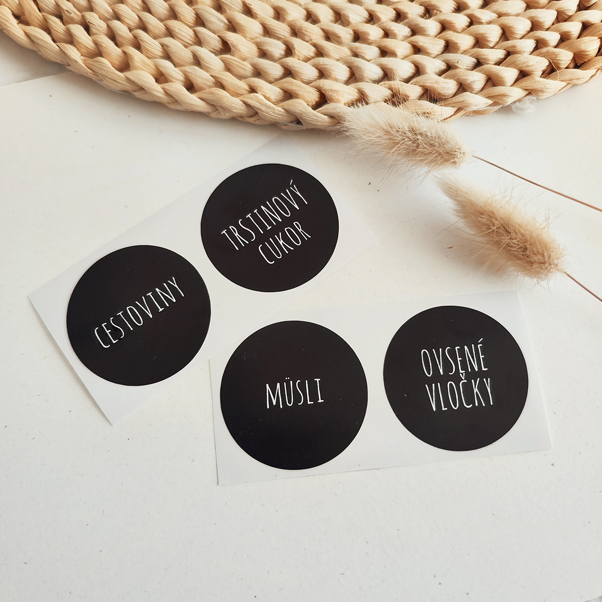 Minimalistické okrúhle nálepky odolné voči vode dokonale doplnia vašu kuchyňu. Vďaka nálepkám môžte označiť rovnaké dózy a dávkovače.