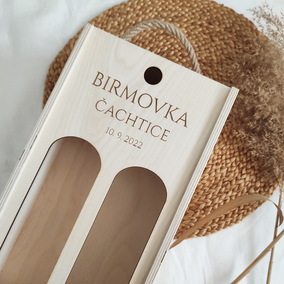 Drevená kazeta, box, krabica na 2ks vína s vlastným gravírovaním. Vygravírovať si môžte vlastný text, poďakovanie, vinš alebo napr. svadobné logo či logo firmy.