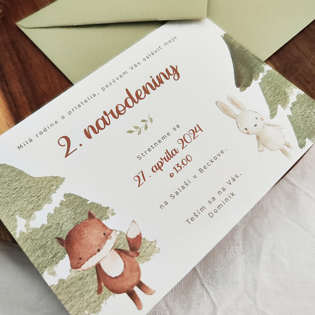 Detská pozvánka na narodeniny s obálkou s lesnými zvieratkami tlačená na hladký matný biely fotopapier, hrúbka 240 gramov.