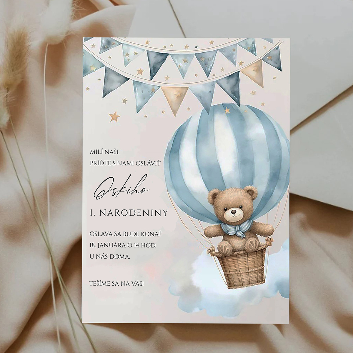 Detská pozvánka na narodeniny s obálkou s mackom v balóne tlačená na štruktúrovaný papier, hrúbka 240 gramov.