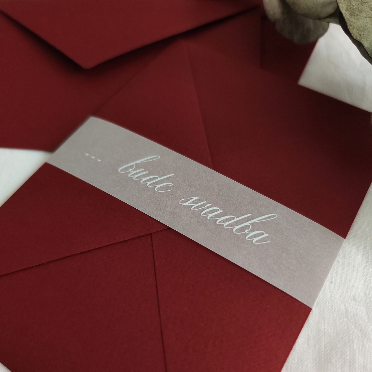 Pásik na obálku vyrobený z transparentného 90g papiera s bielym textom. Písmo na pásiku ladí s oznámeniami Palace white z našej ponuky.