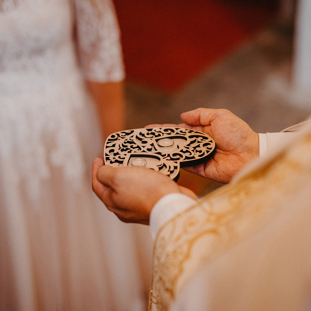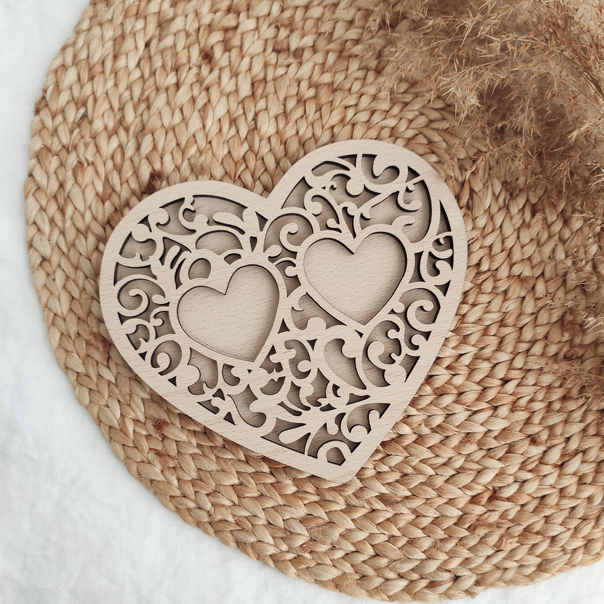 Drevený vyrezávaný podnos na obrúčky v tvare srdiečka vyrobený z kvalitnej preglejky hrúbky 4mm s prírodným hladkým povrchom. Podnos sa skladá sa z 2 vrstiev.