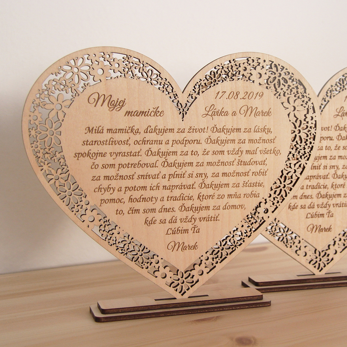 Drevené gravírované srdiečko ako poďakovanie je ideálnym spôsobom ako sa na svadbe poďakovať rodičom za všetko, čo nám v živote dali. Srdiečko vieme upraviť, aby sa dalo použiť napr. aj ako blahoželanie k sviatku, výročiu, vyznanie lásky a pod. Text na srdiečku môžme zmeniť podľa vášho želania. Srdiečka je možné urobiť so stojanom aj bez. Srdiečka so stojanom posielame v zloženom stave, stačí už len položiť na stôl.