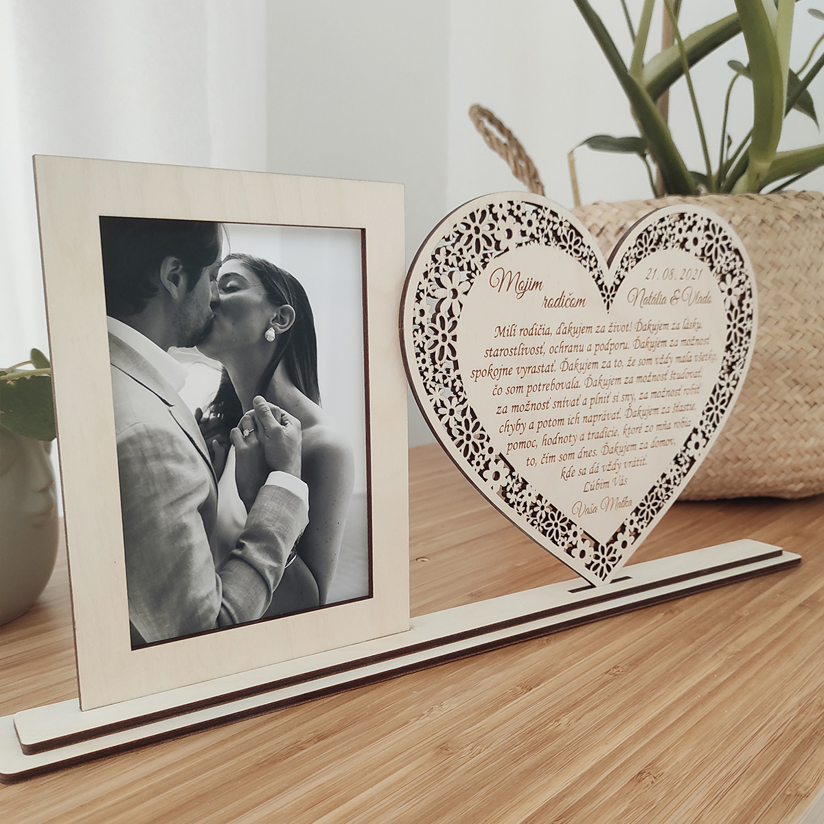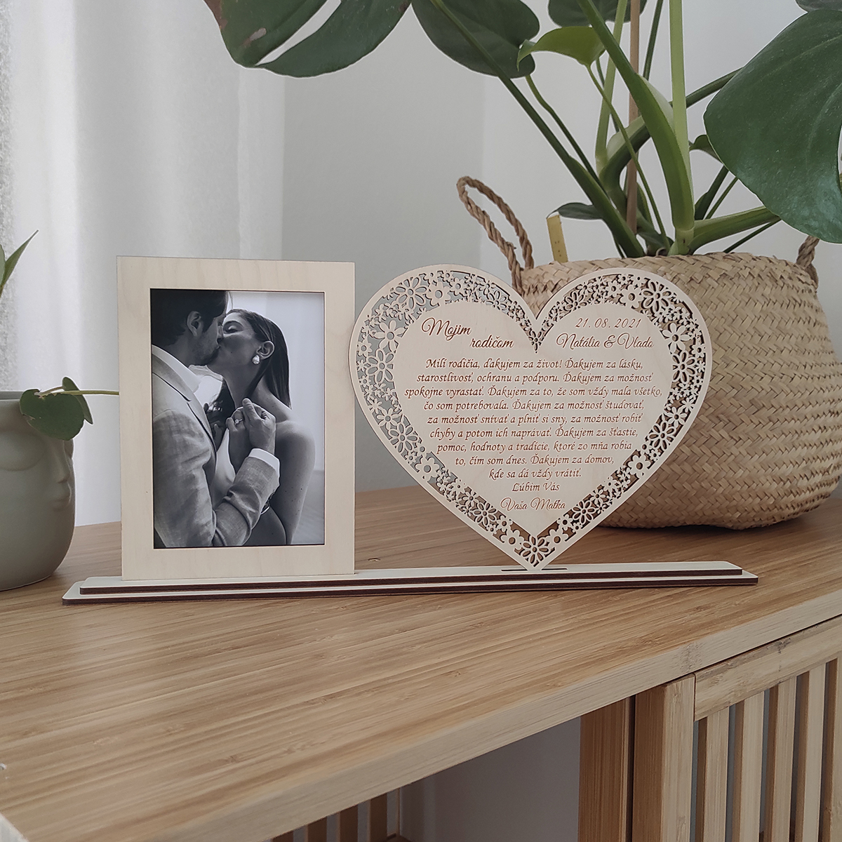 Drevený stojan s gravírovaným srdiečkom ako poďakovanie je ideálnym spôsobom ako sa na svadbe poďakovať rodičom za všetko, čo nám v živote dali. Súčasťou stojanu je aj rámik na fotografiu. Text na srdiečku môžme zmeniť podľa vášho želania.