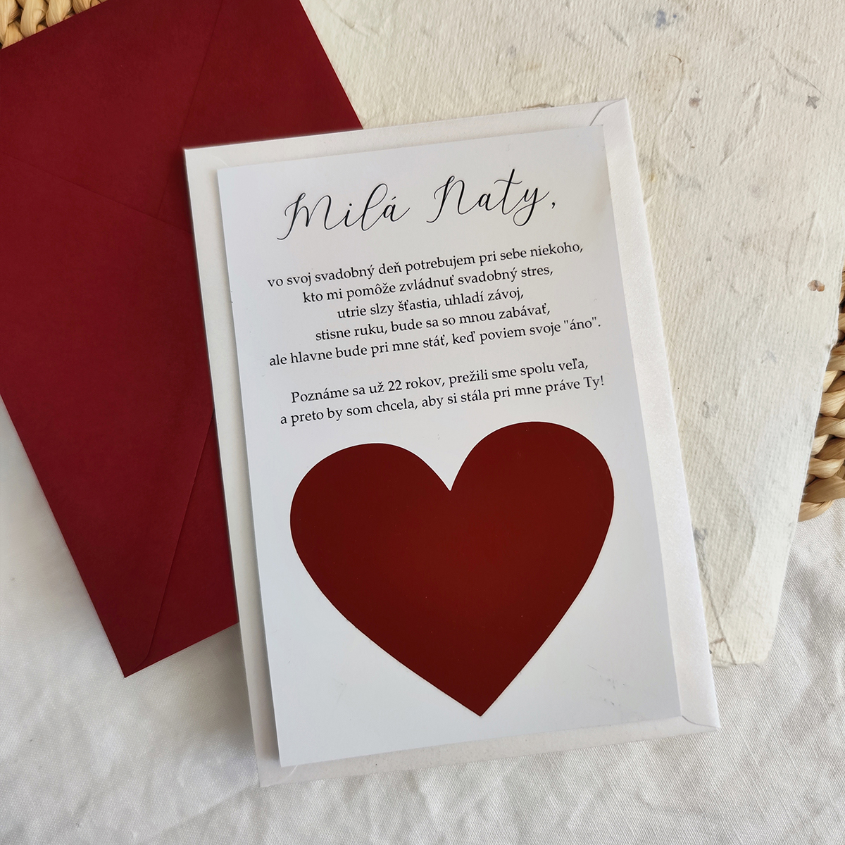 Pozvánka pre svedkyňu alebo družičky s červeným stieracím srdiečkom. Pozvánka je tlačená na 250g matný fotopapier.