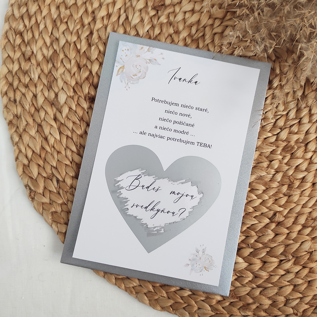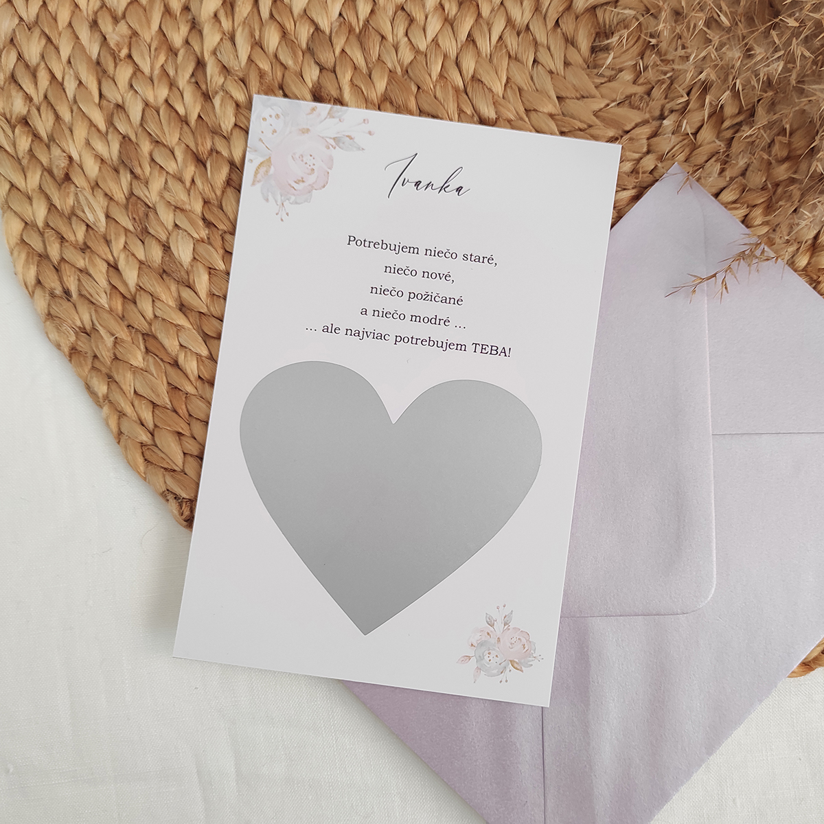 Pozvánka pre svedkyňu alebo družičky s rose gold stieracím srdiečkom. Pozvánka je tlačená na 250g matný fotopapier.