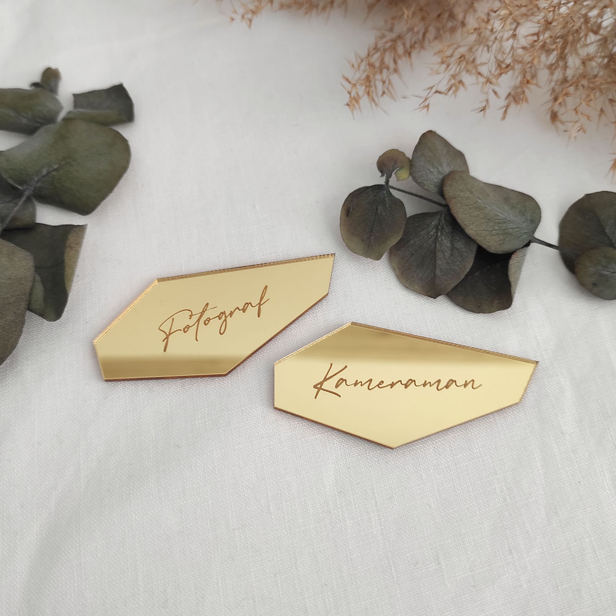 Zrkadlový výrez v tvare črepu s vygravírovaným menom môžte použiť ako menovku na svadbu alebo akúkoľvek inú oslavu. Výrez je vyrezaný z kvalitného zlatého/strieborného plexiskla so zrkadlovým efektom.