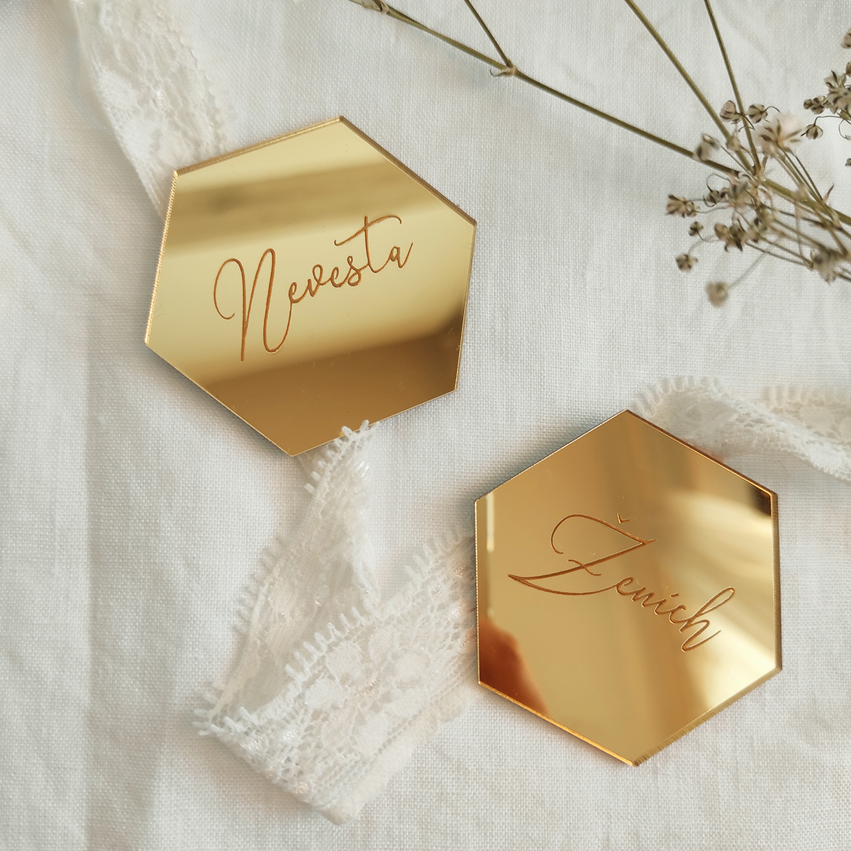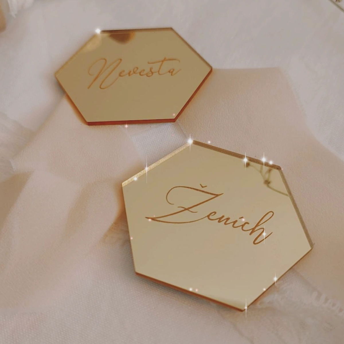 Zrkadlový výrez v tvare kruhu s vygravírovaným menom môžte použiť ako menovku na svadbu alebo akúkoľvek inú oslavu. Výrez je vyrezaný z kvalitného zlatého/strieborného plexiskla so zrkadlovým efektom.