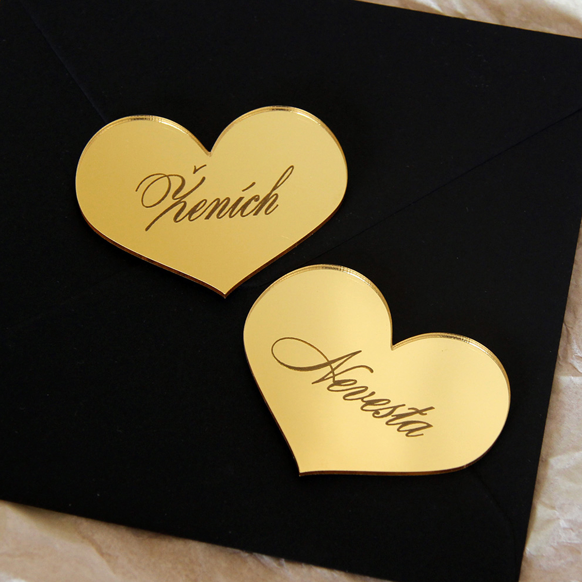 Zrkadlový výrez v tvare srdiečka s vygravírovaným menom môžte použiť ako menovku na svadbu alebo akúkoľvek inú oslavu. Výrez je vyrezaný z kvalitného zlatého/strieborného plexiskla so zrkadlovým efektom.