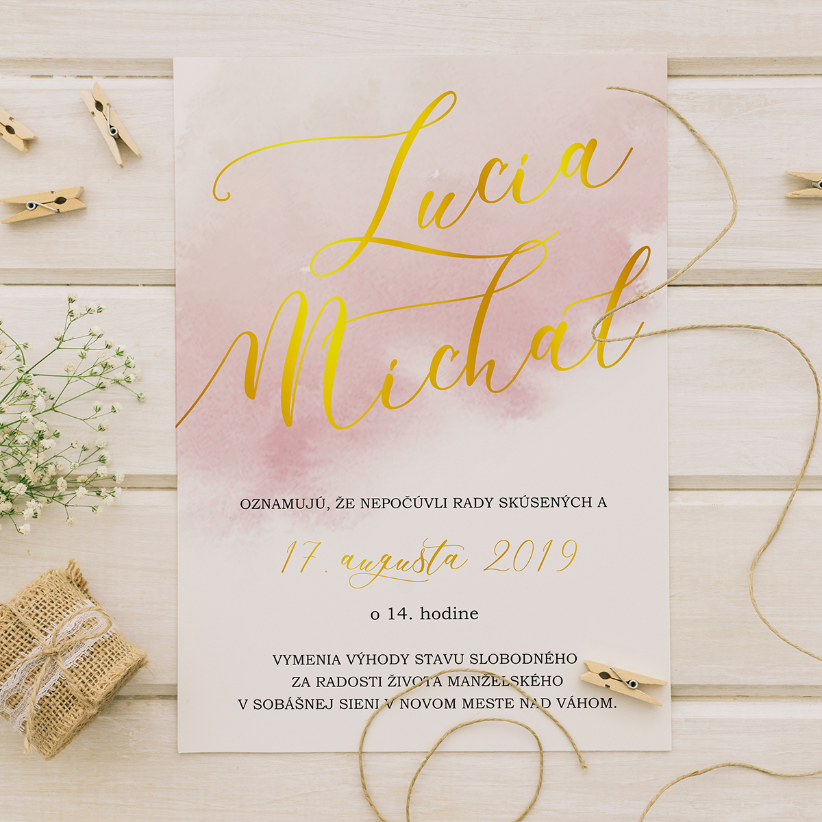Svadobné oznámenie Dusty pink s textom tlačeným zlatou fóliou, ktorý ho robí honosným. Oznámenie je tlačené na hladký matný biely fotopapier, hrúbka 240 gramov. Text prispôsobíme podľa vašich predstáv.