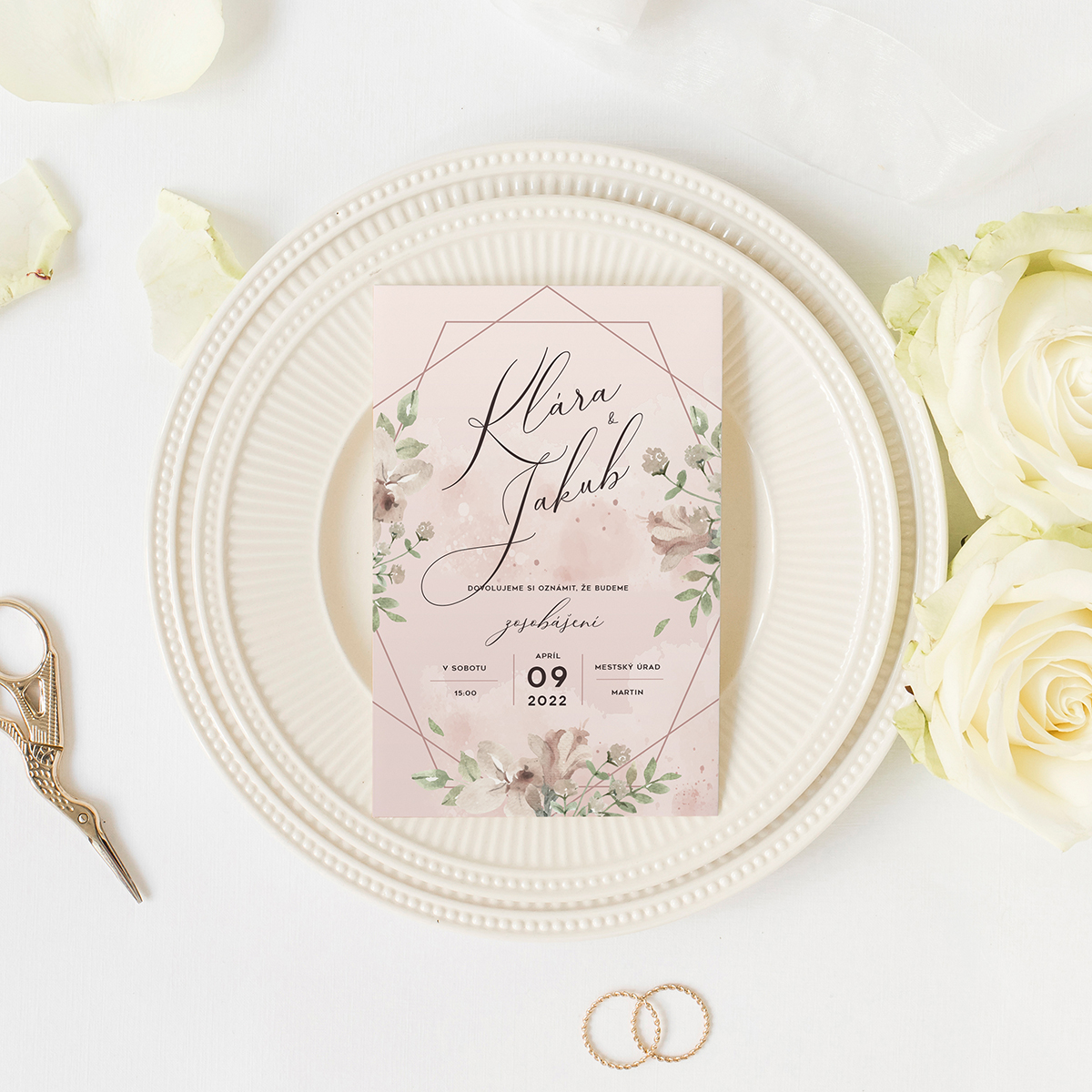 Svadobné oznámenie Ružové kvety tlačené jednostranne na hladký matný biely fotopapier, hrúbka 240 gramov. Text prispôsobíme podľa vašich predstáv.