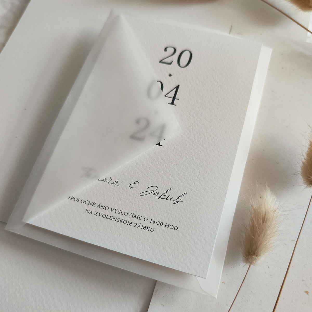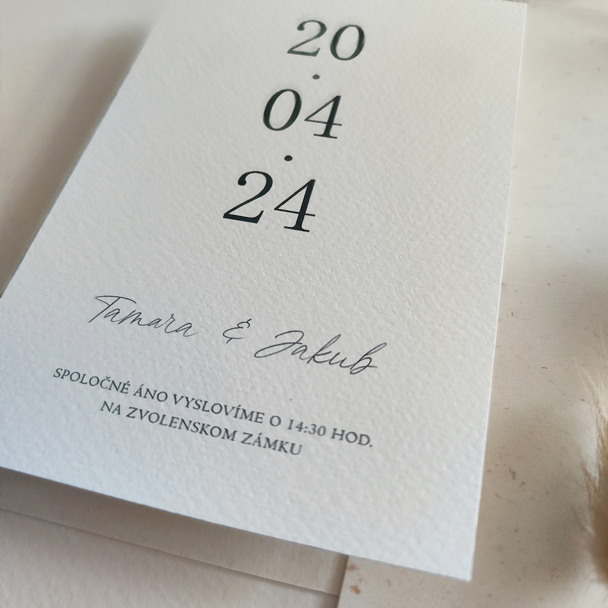 Svadobné oznámenie v jednoduchom štýle tlačené na kreatívny ekologický štrukturovaný papier. Papier je vyrábaný vo Francúzsku a má výnimočnú vlastnosť, že pôsobí hrubšie a pevnejšie ako ostatné papiere s rovnakou gramážou.