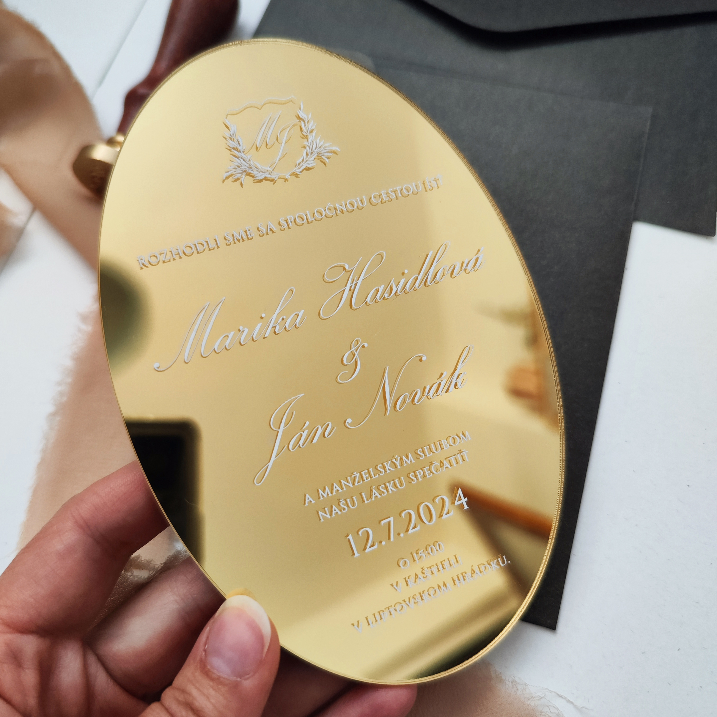 Luxusné a moderné svadobné oznámenie tlačené bielou na zrkadlové plexi v zlatej alebo striebornej farbe.