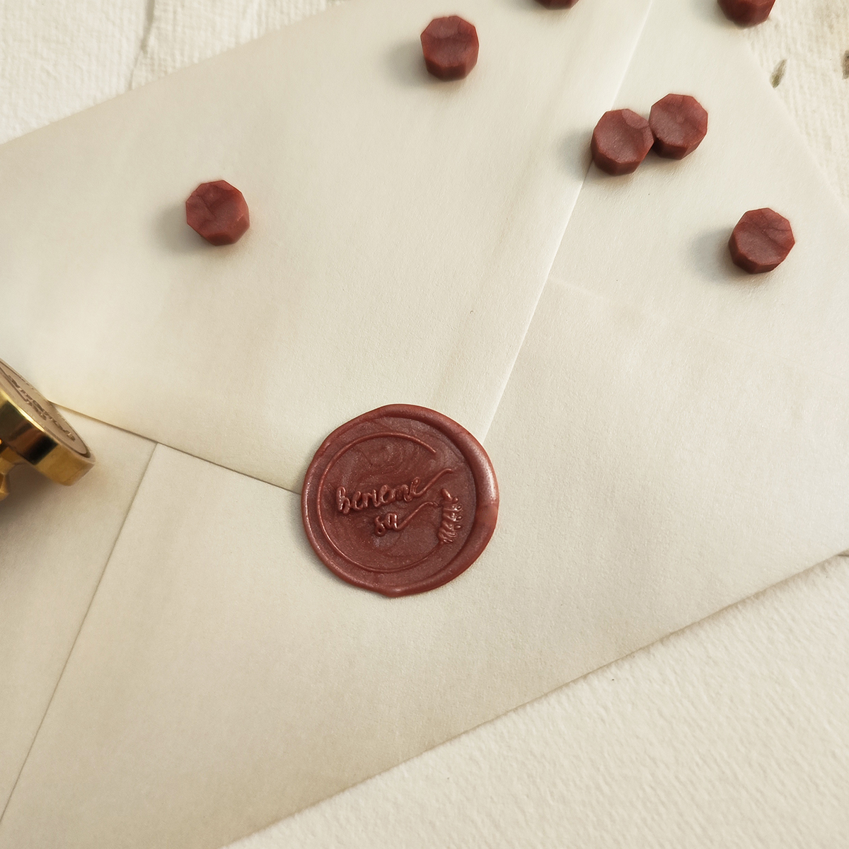 Hotové pečate z pečatného vosku s nápisom Berieme sa. Pečate majú zo zadnej strany nálepku, ktorú jednoducho odlepíte a nalepíte pečať napr. na obálku.