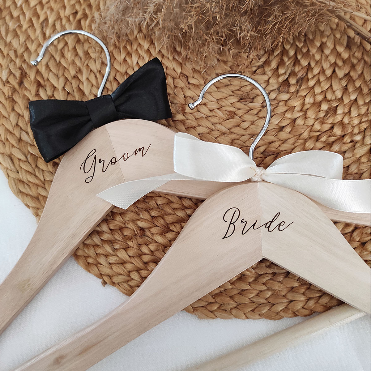 Drevené svadobné vešiaky pre nevestu a ženícha s textom Bride & Groom. Nevesta má vešiak s krémovou saténovou mašličkou a ženích s čiernym motýlikom. Uvedená cena je za set 2 ks vešiakov.