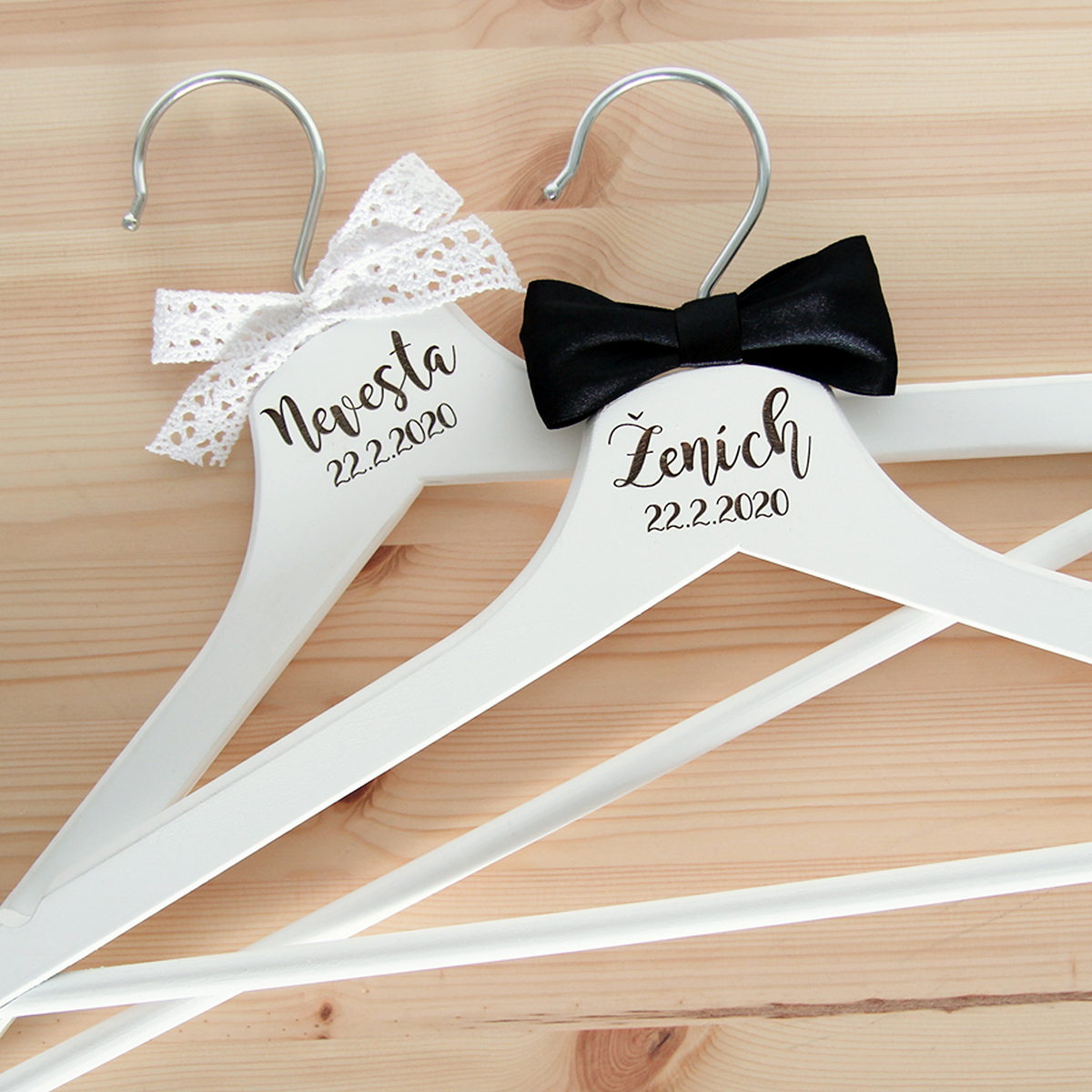 Svadobné vešiaky s vygravírovaným textom nevesta a ženích a dátumom