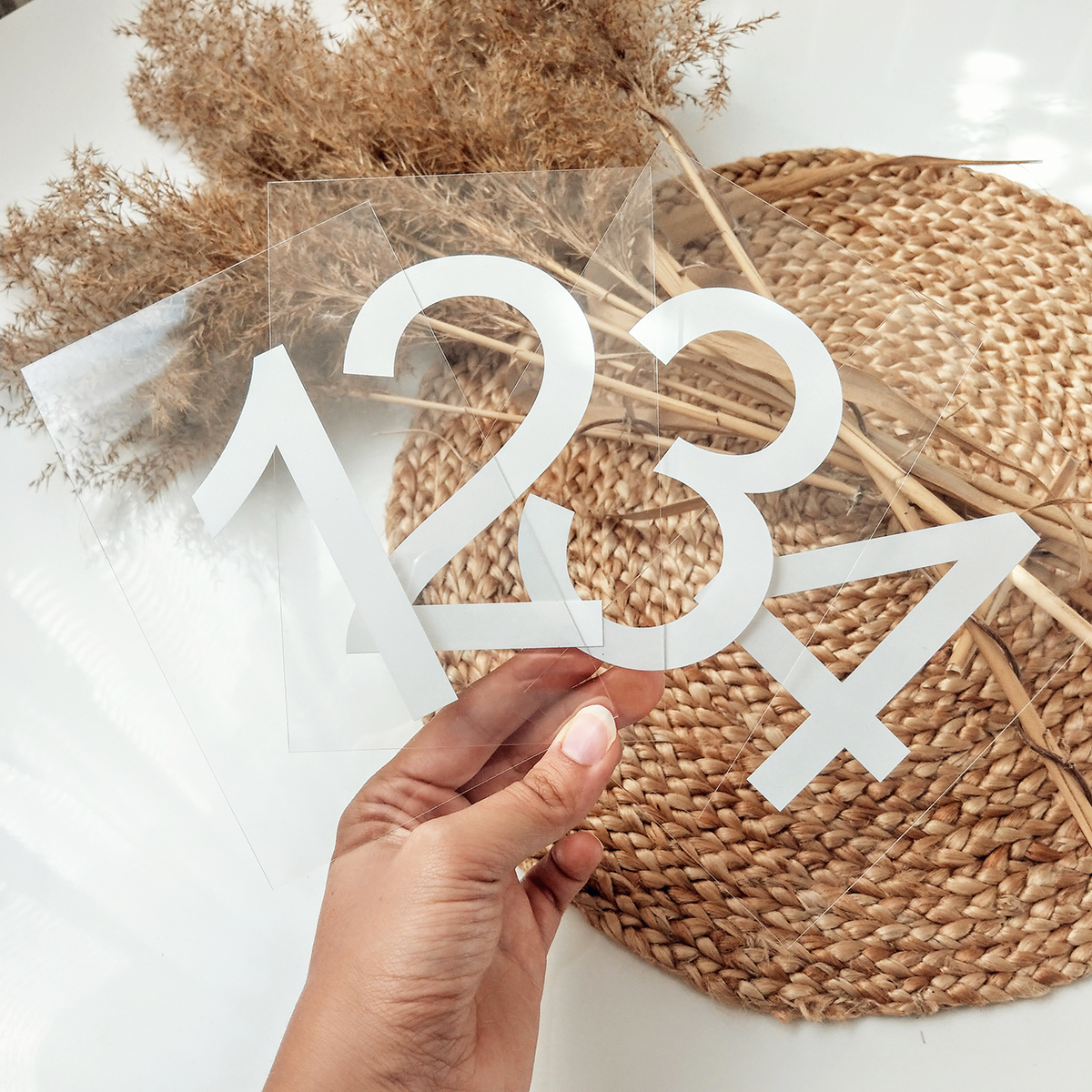 Čísla v jednoduchom minimalistickom bielom dizajne na očíslovanie svadobných stolov tlačené UV tlačou na transparentné plexi. Vďaka UV tlači sú písmená vystúpené, akoby 3D.