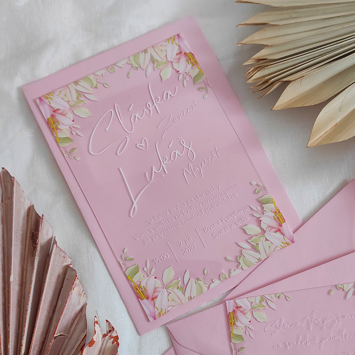 Transparentné svadobné oznámenie s kvetmi tlačené farebnou UV tlačou na transparentné plexi. Vďaka UV tlači je text mierne vystúpený, akoby 3D.