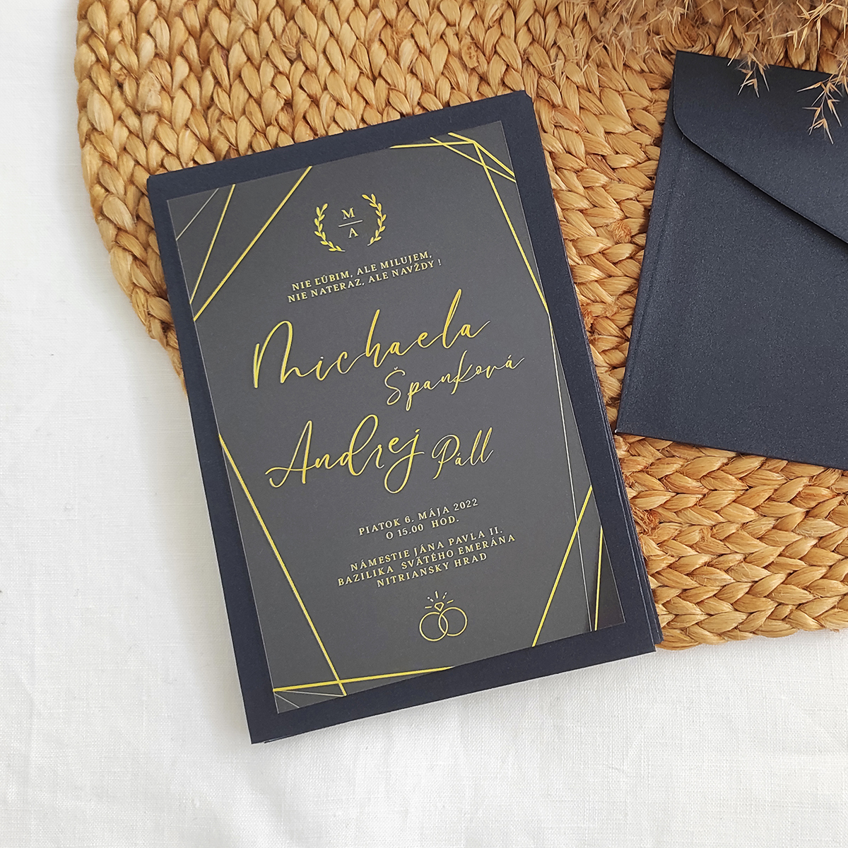 Transparentné svadobné oznámenie so zlatými linkami tlačené farebnou UV tlačou na transparentné plexi. Vďaka UV tlači je text mierne vystúpený, akoby 3D. Zlatá farba nie je metalická!