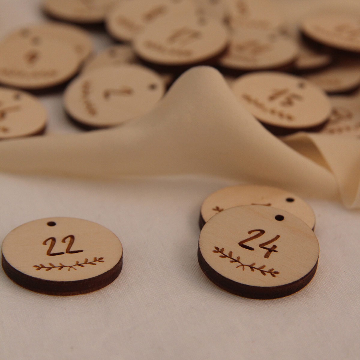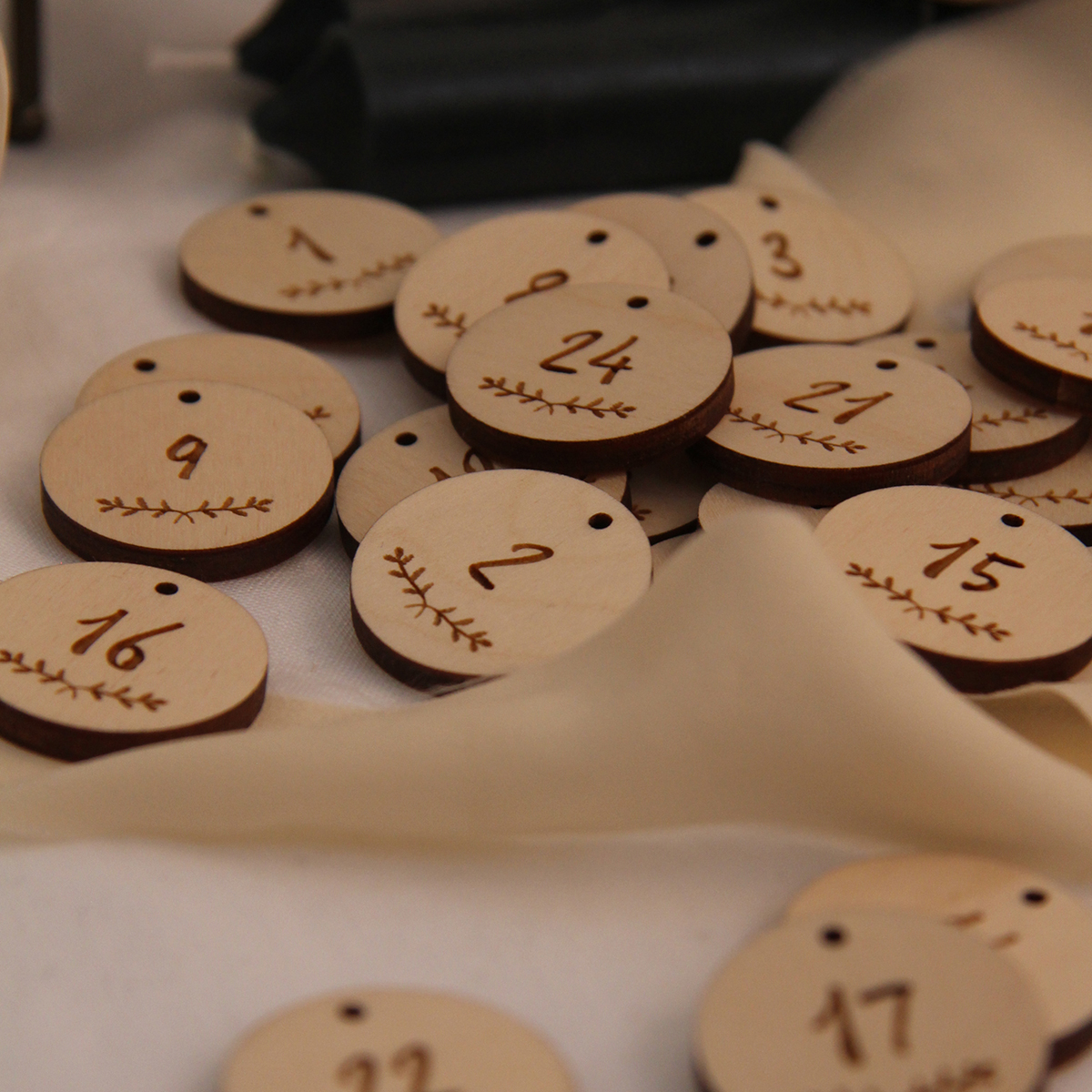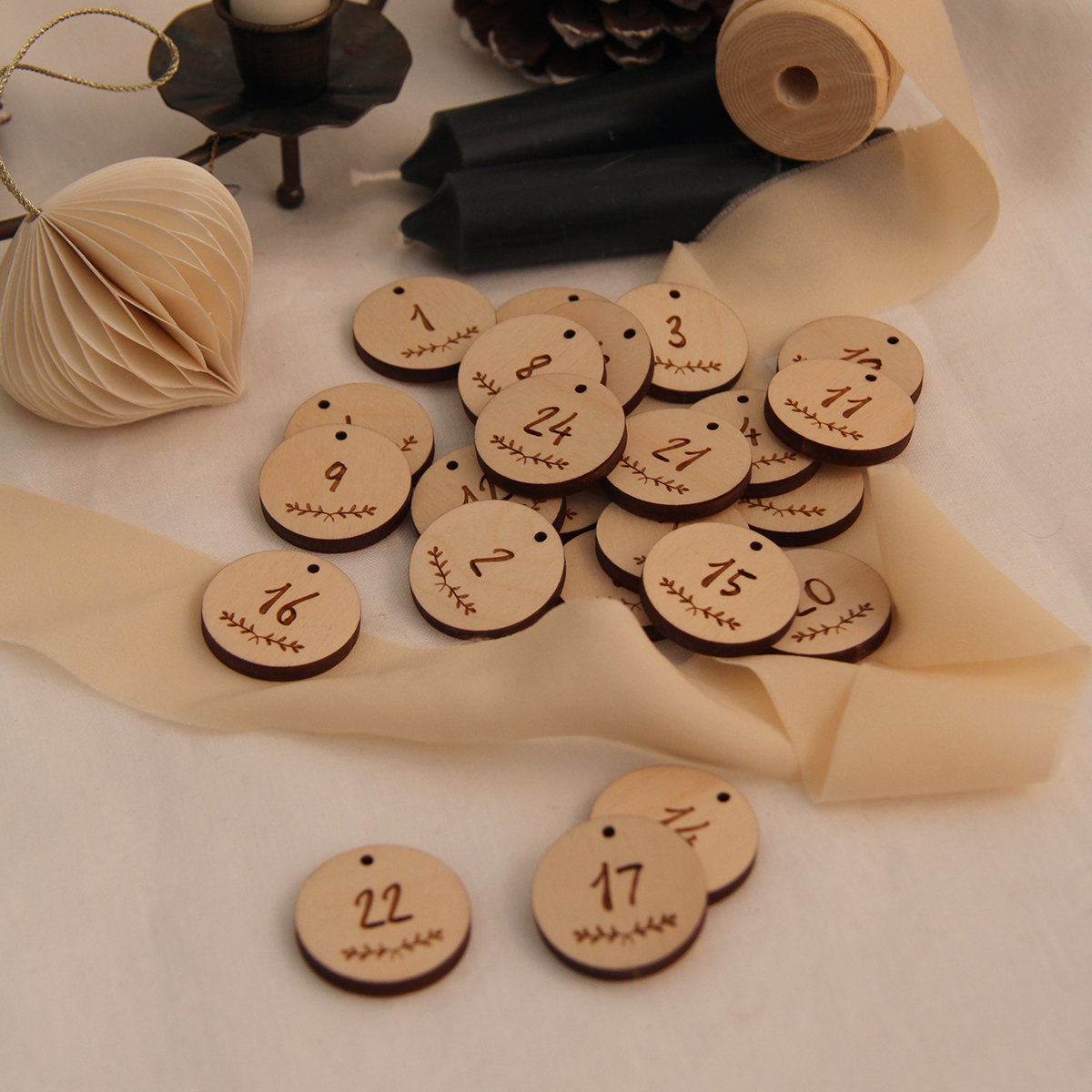 Drevené čísla na adventný kalendár v tvare krúžkov s vygravírovanými číslami a vetvičkou. Čísla sú vyrezané z preglejky hrúbky 4mm, povrch je prírodný, prebrúsený dohladka.
