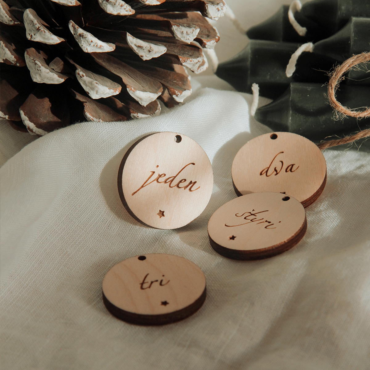 Drevené krúžky na adventný veniec s vygravírovanými číslicami. Čísla môžte pripevniť na klasický veniec alebo zavesiť na sviečky. Čísla sú vyrobené z kvalitnej preglejky hrúbky 4mm s prírodným hladkým povrchom.