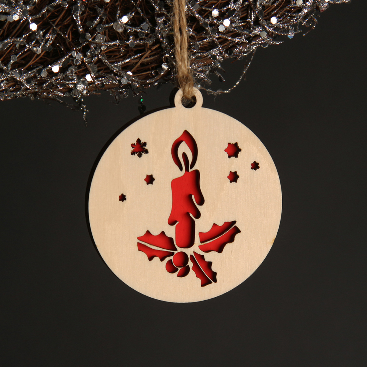 Originálna drevená vianočná ozdoba, ktorá sa skladá z dvoch vrstiev preglejky. Spodná vrstva je bez vzoru namaľovaná farbou (modrá, červená alebo iná - informujte sa o dostupnosti farieb) a do vrchnej vrstvy je vypálený vianočný motív. Ozdoby dodávame so šnúrkou na zavesenie.