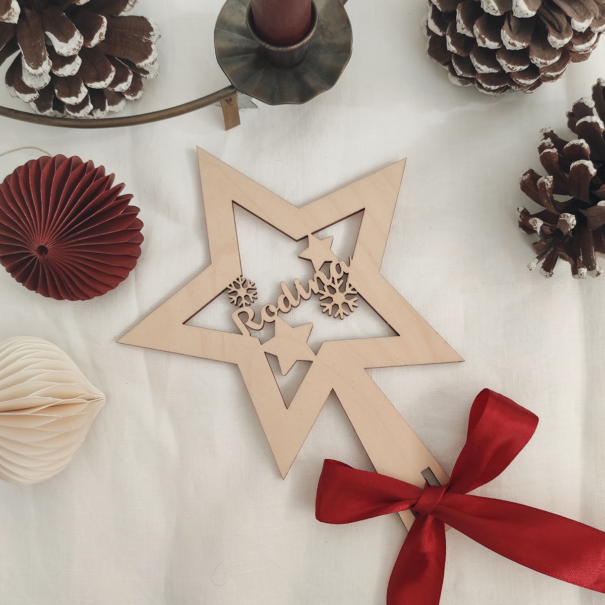 Drevená hviezda na vrch stromčeka s textom Rodina. Súčasťou hviezdy je aj stužka, pomocou ktorej si hviezdu priviažete na vrchol stromčeka.