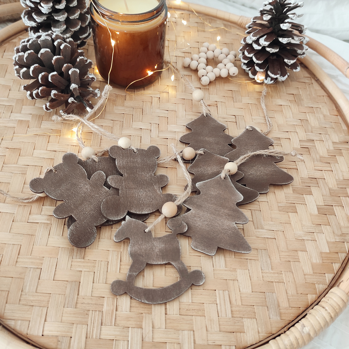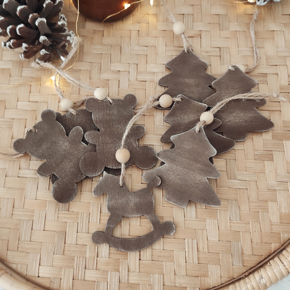 Sada 8ks drevených ozdôb na stromček v hnedej farbe so starým ošúchaným vzhľadom. Doplnené sú prírodným špagátom a drevenou korálkou na zavesenie. Zdobené z oboch strán.
