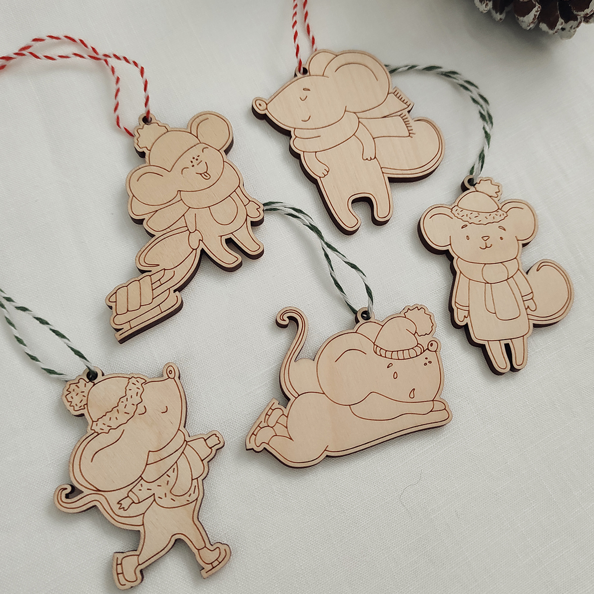 Sada 5 ks drevených gravírovaných vianočných ozdôb s myškami. Sada je dodávaná v darčekovom balení. Ozdôbky tak môžte darovať svojim blízkym alebo si ich po Vianociach starostlivo odložiť na ďalší rok.