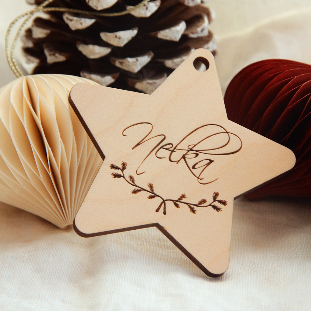 Vianočná ozdoba vyrezaná z preglejky hrúbky 4mm s gravírovaným vianočným motívom, menom alebo menom aj s rokom. Povrch je prírodný, prebrúsený do hladka.