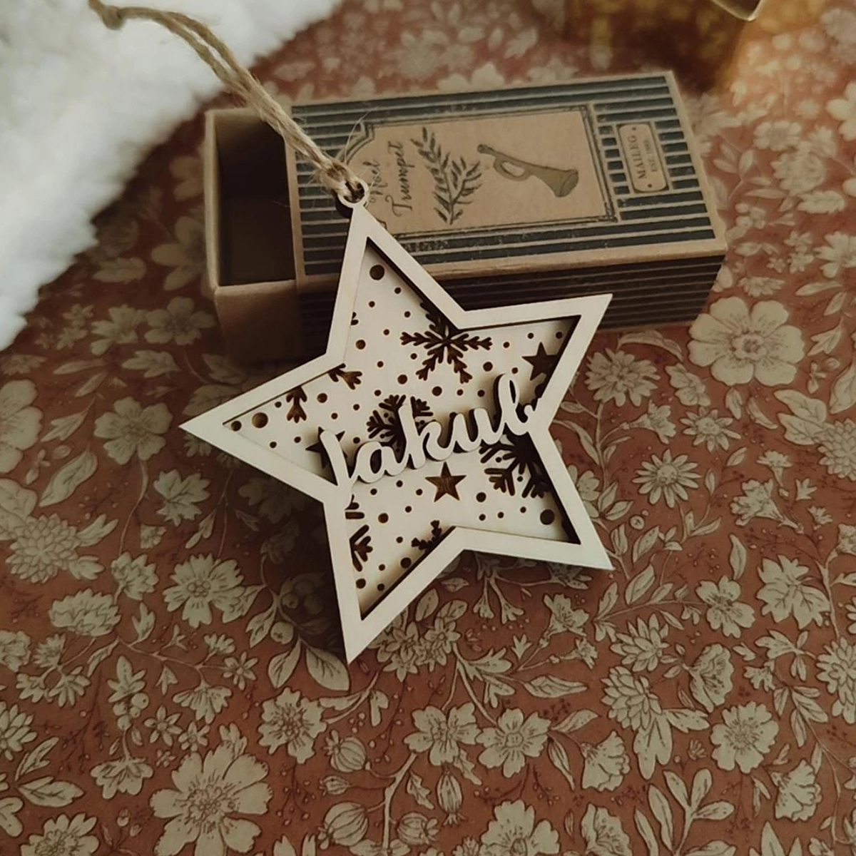 Personalizovaná vianočná hviezda s menom sa skladá z dvoch vrstiev preglejky. Na spodnej vrstve je vygravírovaný vianočný motív a na vrchnej vrstve je vyrezané meno.