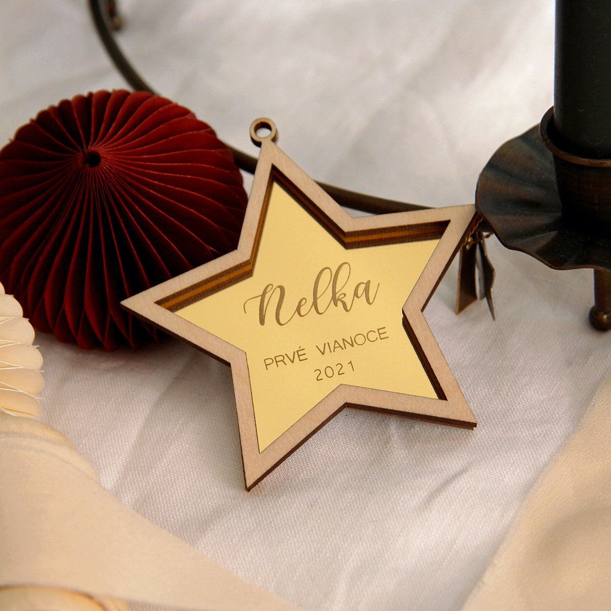 Táto jedinečná personalizovaná ozdoba je vyrobená zo zrkadlového zlatého alebo strieborného plexiskla v kombinácii s drevenou preglejkou. Hrúbka ozdoby je spolu 6mm.