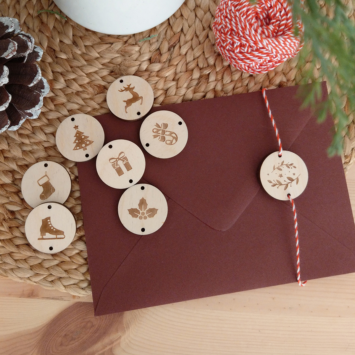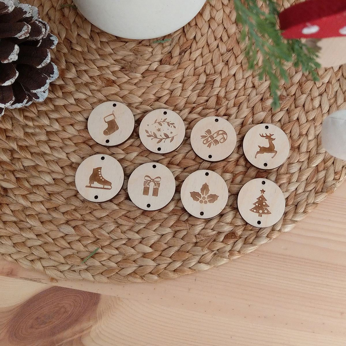 Set 8ks drevených gravírovaných štítkov na darčeky s rôznymi vianočnými motívmi. Štítky sú vyrezané z kvalitnej preglejky hrúbky 4mm s prírodným hladkým povrchom.