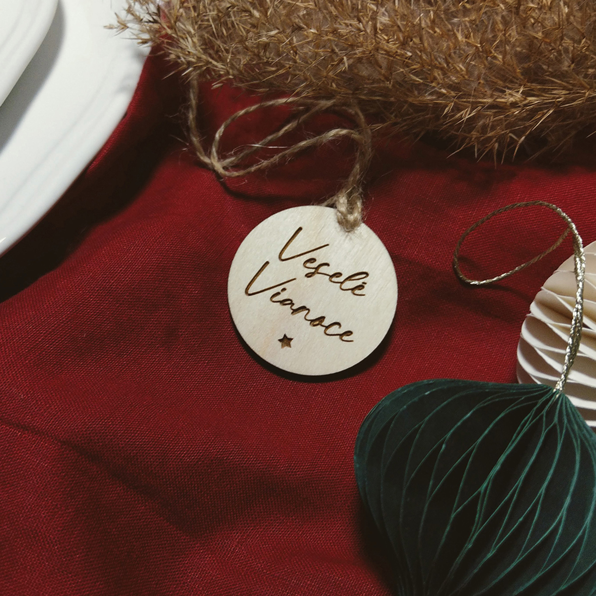 Drevený štítok na darčeky s vygravírovaným textom Veselé Vianoce doplneným hviezdičkou. Štítok je vyrezaný z kvalitnej preglejky hrúbky 4mm s prírodným hladkým povrchom.