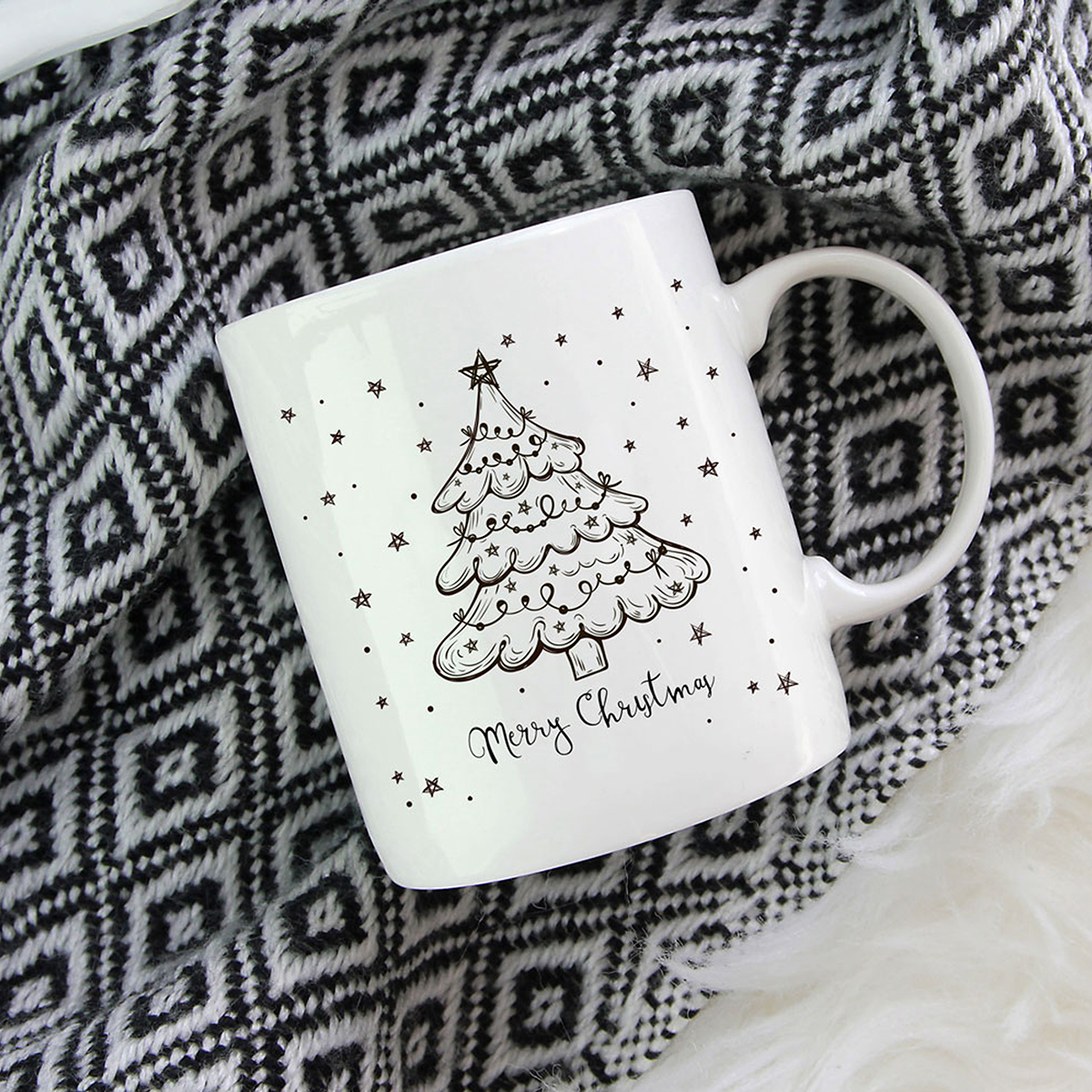 Biely kramický hrnček potlačený jednoduchým vianočným motívom.