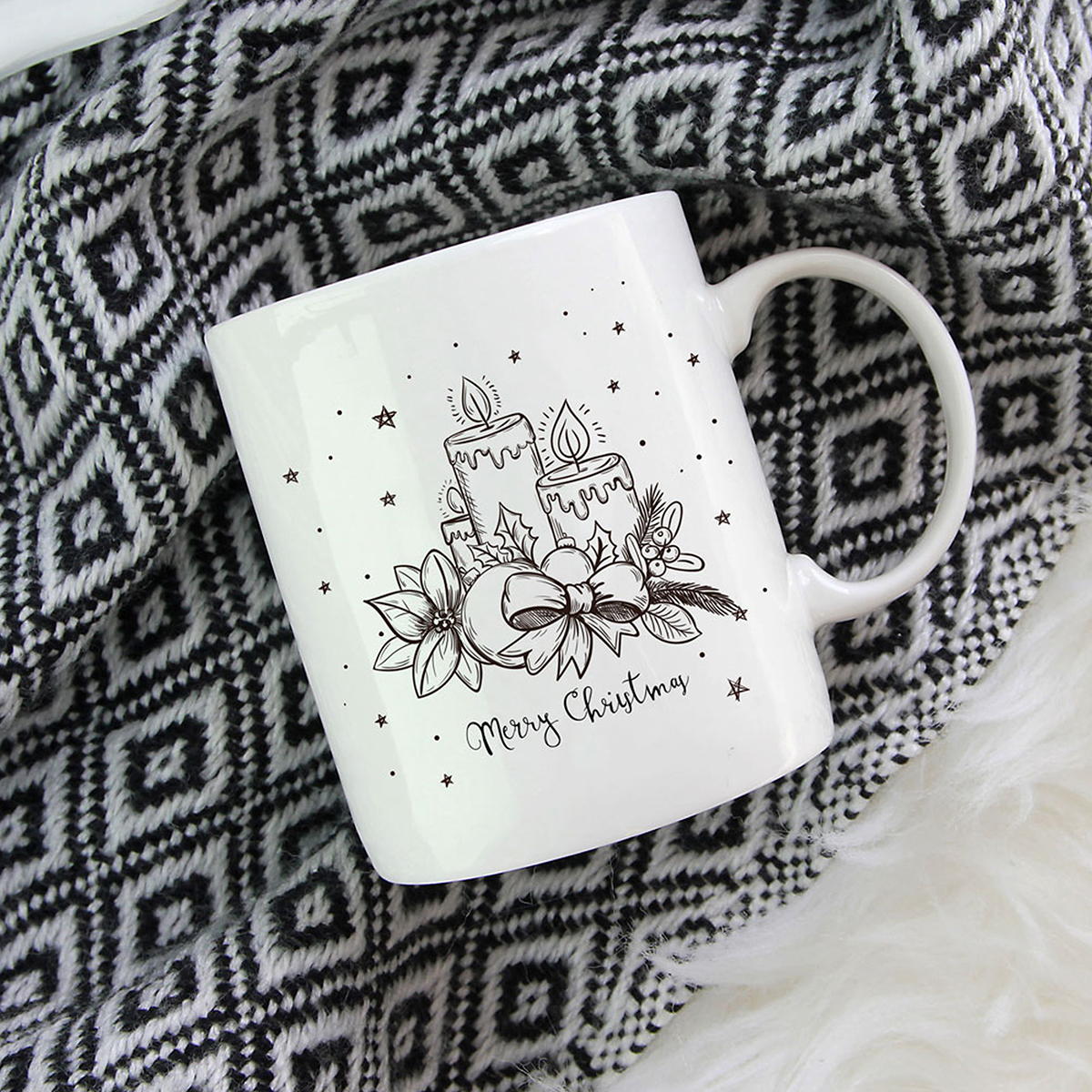 Biely kramický hrnček potlačený jednoduchým vianočným motívom.
