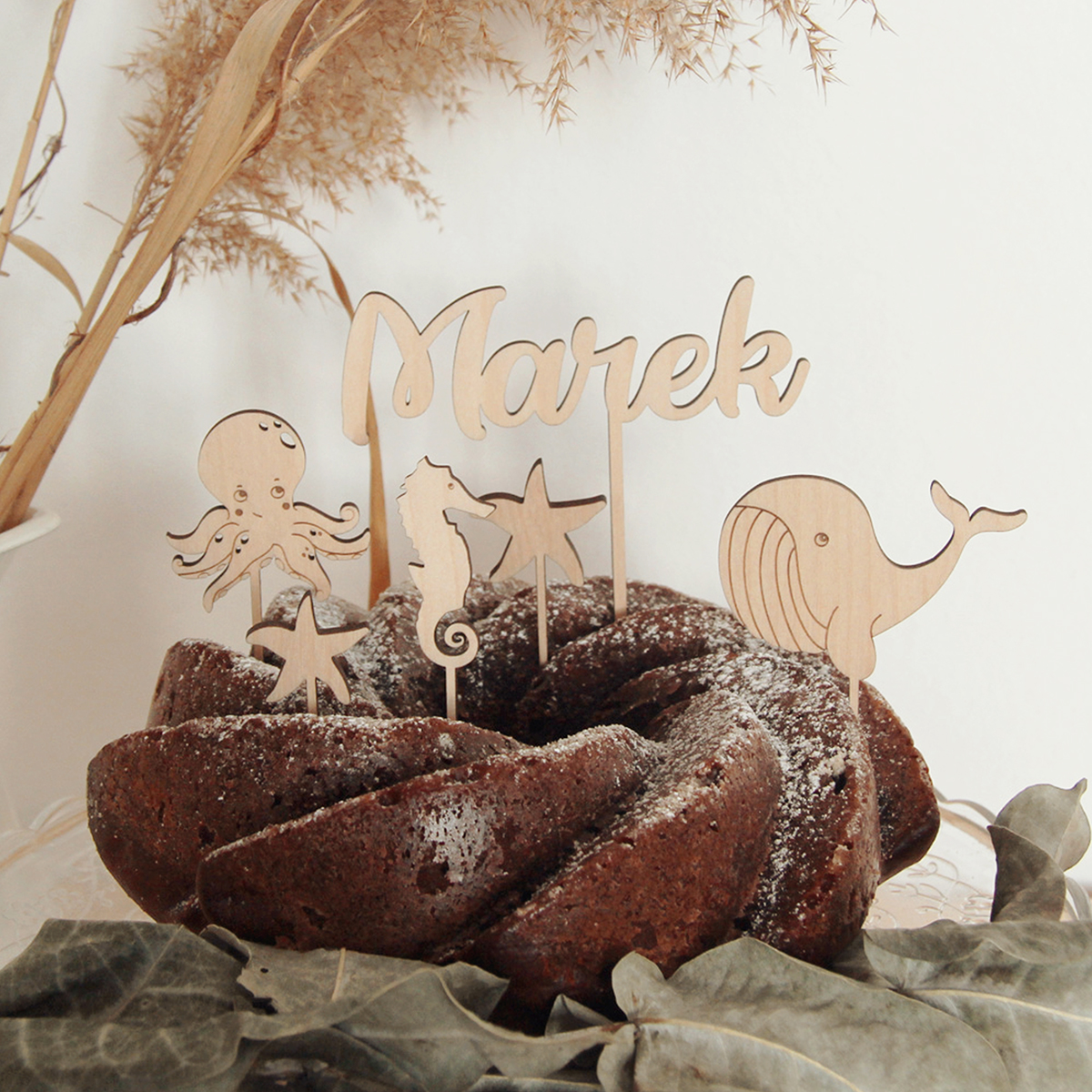 Drevené zápichy na tortu s morskými živočíchmi a menom skvelo doplnia tématickú tortu alebo koláč. Zápichy sú vyrobené z kvalitnej preglejky hrúbky 4mm.