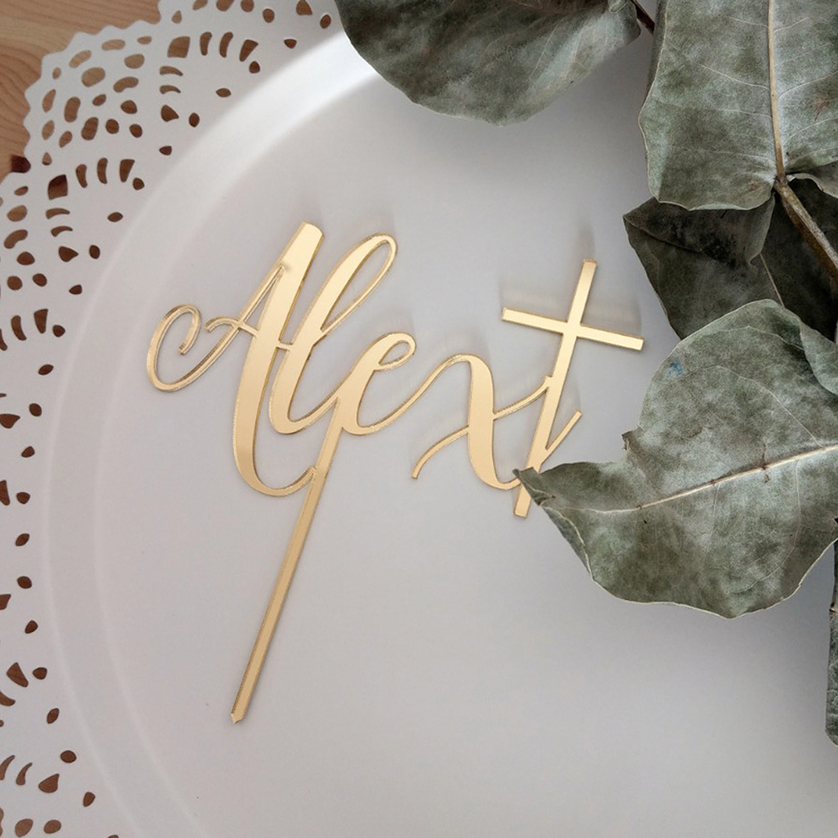 Vyrezávaný luxusný zápich na tortu zo strieborného alebo zlatého zrkadlového plexiskla. Zápich na tortu môžte využiť na tortu na krst alebo prijímanie alebo ako dekoráciu.