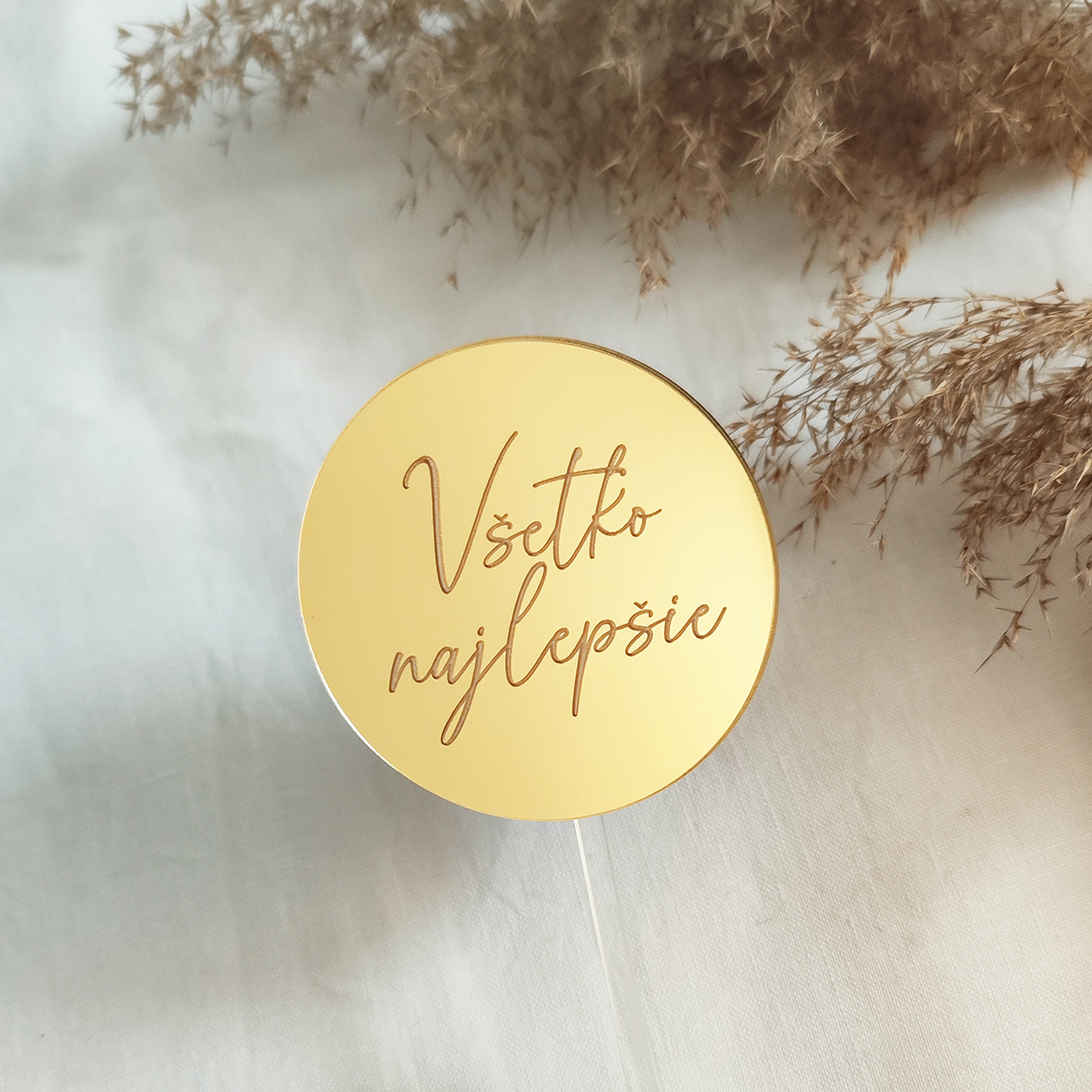 Vyrezávaný luxusný zápich na tortu zo strieborného alebo zlatého zrkadlového plexiskla s textom Všetko najlepšie.