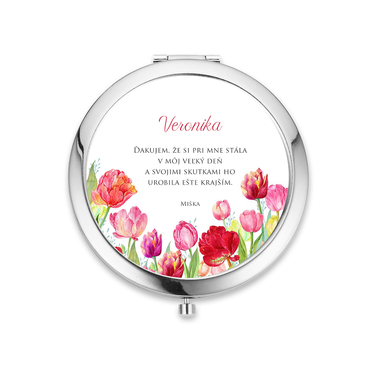 Kvalitné zrkadielko do kabelky s jednoduchým otváraním pomocou stlačenia. Zrkadielko je milým aj praktickým darčekom na koniec školského roka, na deň učiteľov alebo ako pamiatku pre pani učiteľku. Vo vnútri sú dve zrkadielka. Zrkadielko je z bižutérneho kovu bez obsahu niklu, olova a kadmia a grafický obrázok je pod vrstvou živice. Obrázok má priemer 57mm.